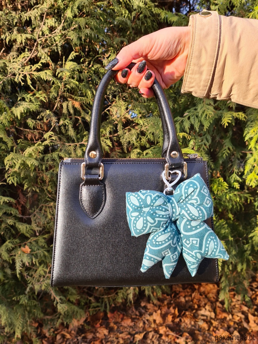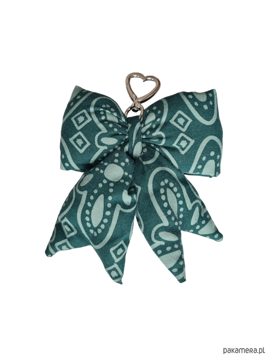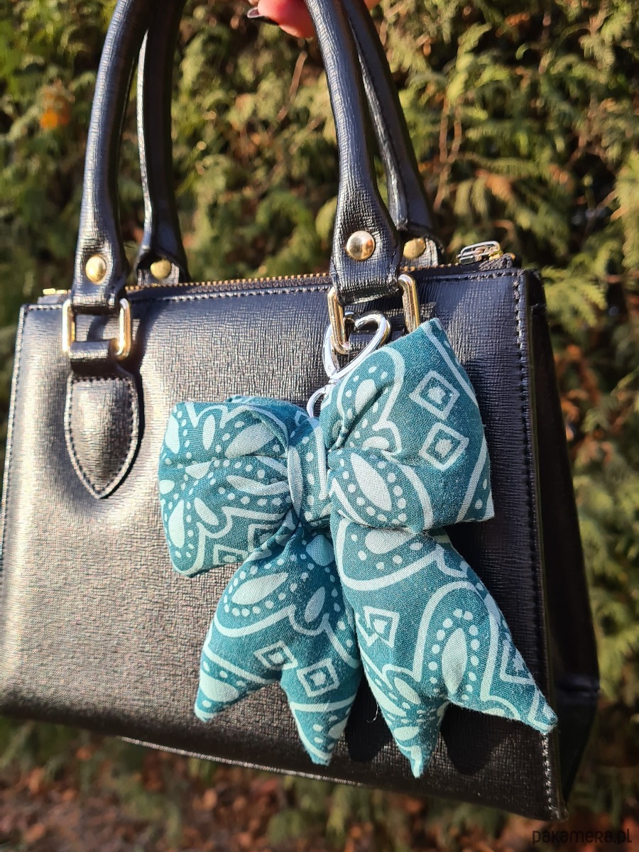 Uroczy brelok w kształcie kokardy, uszyty ręcznie z materiałów z drugiego obiegu. Wypełniony jest ścinkami z owaty, która normalnie wylądowałaby już na śmietniku, ale my dałyśmy im kolejną szansę w pięknym wydaniu. Dzięki karabińczykowi może służyć jako stylowa ozdoba torebki lub praktyczna zawieszka do kluczy. Każdy egzemplarz jest niepowtarzalny.