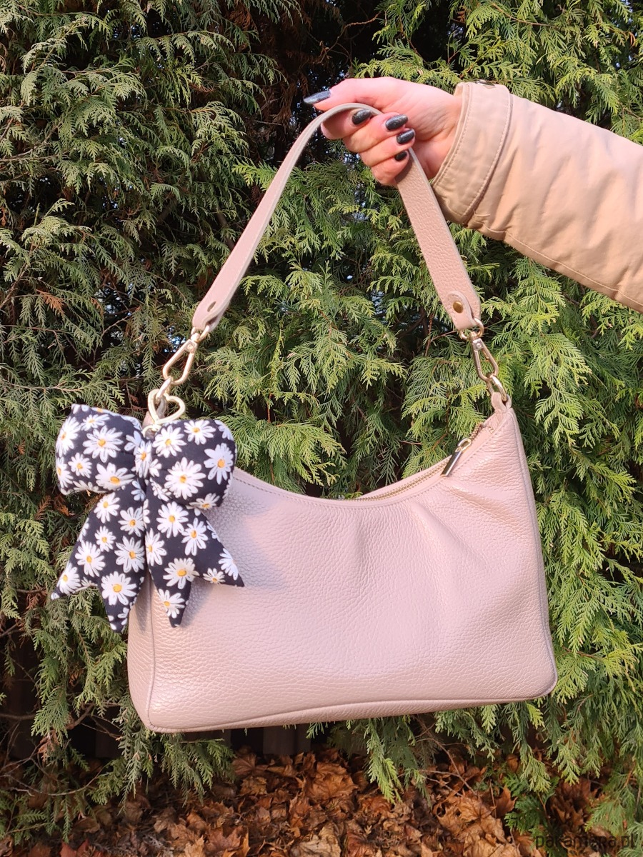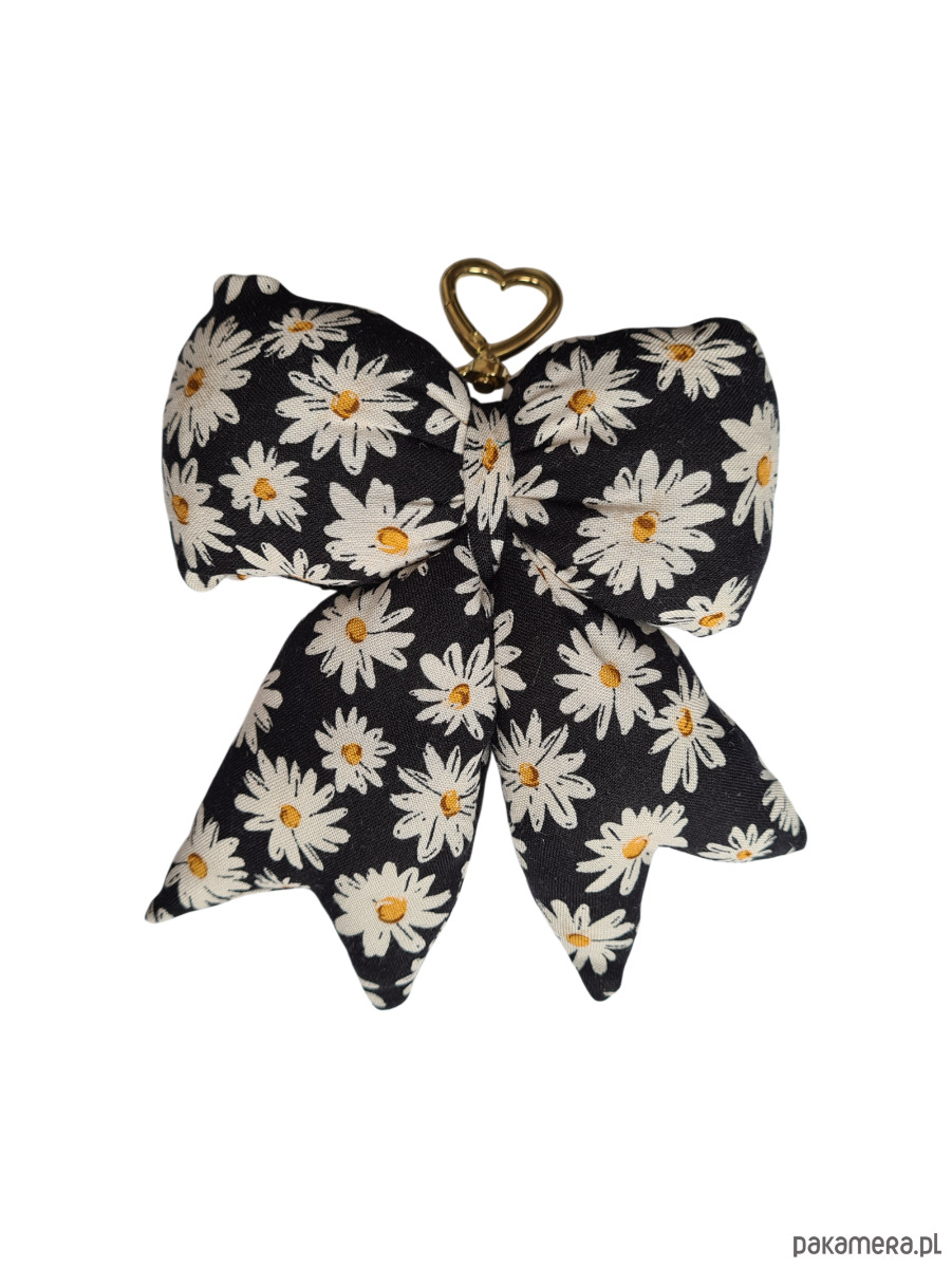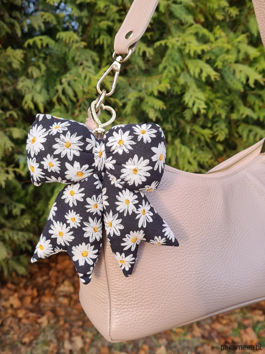 Uroczy brelok w kształcie kokardy, uszyty ręcznie z materiałów z drugiego obiegu. Wypełniony jest ścinkami z owaty, która normalnie wylądowałaby już na śmietniku, ale my dałyśmy im kolejną szansę w pięknym wydaniu. Dzięki karabińczykowi może służyć jako stylowa ozdoba torebki lub praktyczna zawieszka do kluczy. Każdy egzemplarz jest niepowtarzalny.