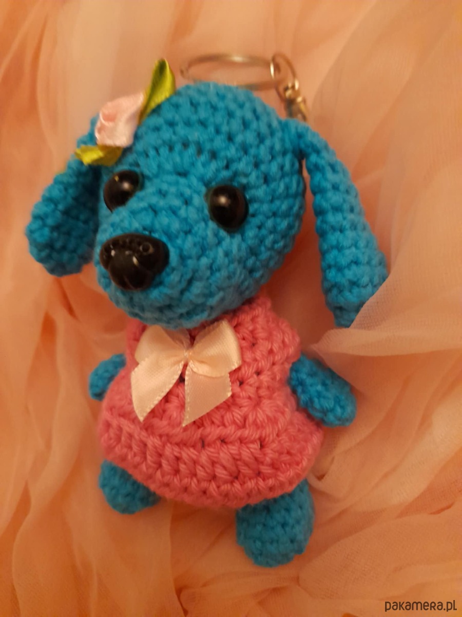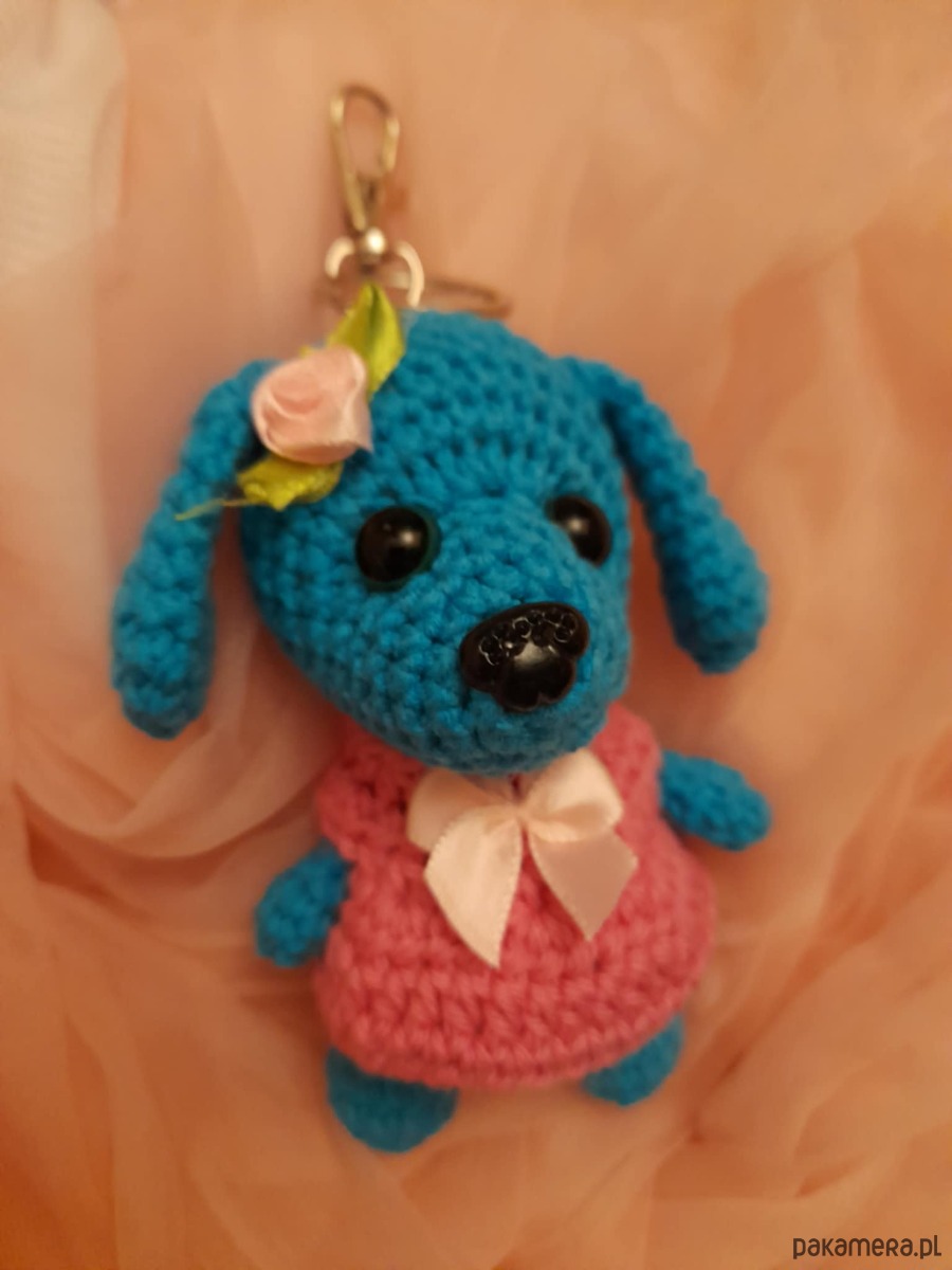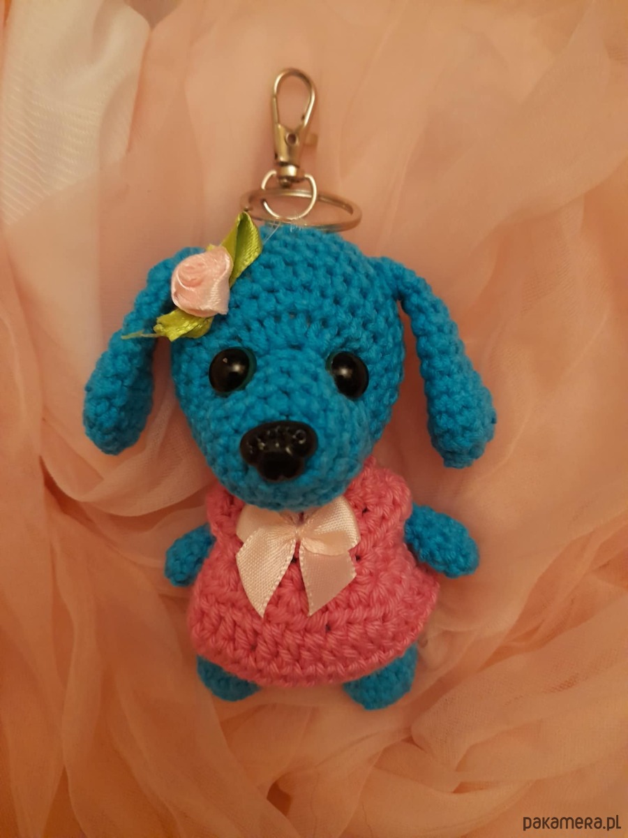 Breloczek w kształcie pieska wykonany z włóczki.. Piesek ma 11 cm. Jest bardzo uroczy i przynosi szczęście.Kolor morski, Sukienka różowa.