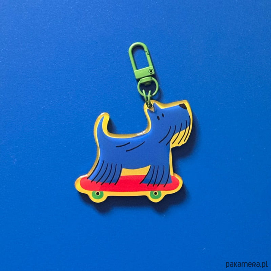 Poznaj Jake'a – najbardziej stylowego psa w mieście! Ten niebieski terier na czerwonej deskorolce to esencja radosnego designu. Idealny dla miłośników czworonogów i każdego, kto chce dodać swoim kluczom odrobinę luzu. Wyraziste kolory i zielone zapięcie tworzą zestaw, którego nie da się przeoczyć.