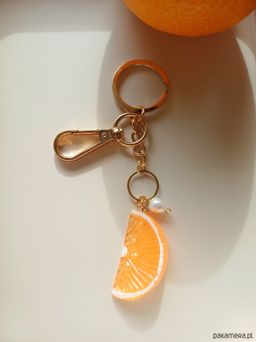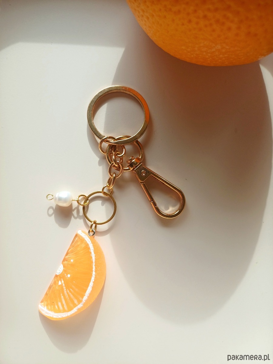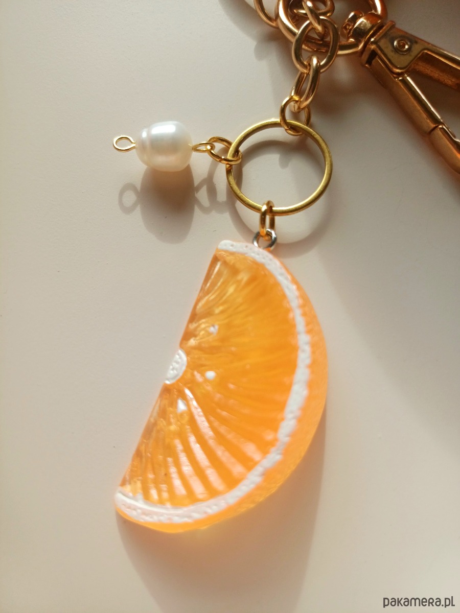 Elementy : podstawa breloka metalowa, koło mniejsze : stal szlachetna , pomarańcza - wykonana z akrylu, perła naturalna : 8 mm