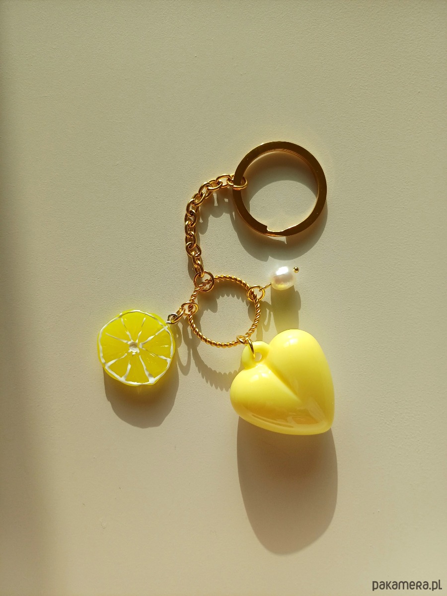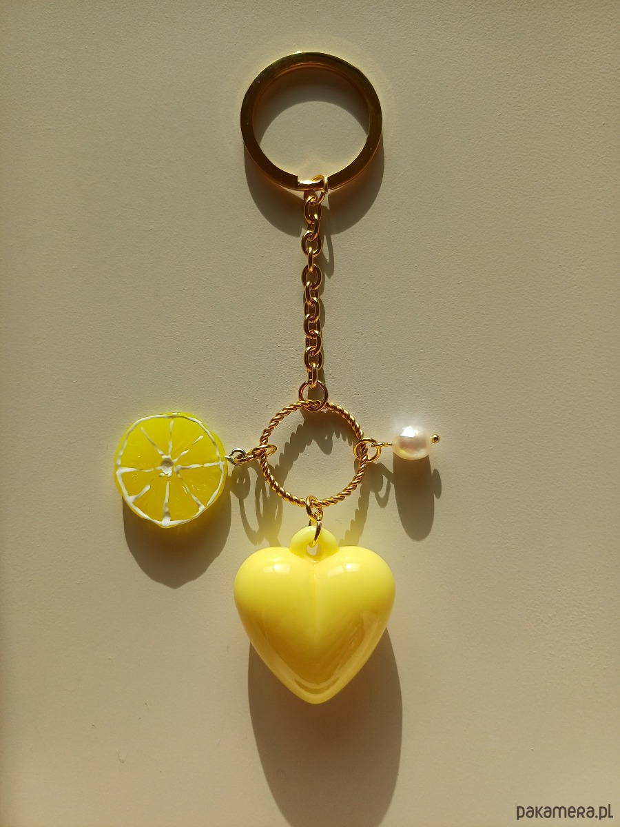Elementy : podstawa breloka wykonana ze stali szlachetnej, serce - wykonane z akrylu, cytryna - akryl , perła naturalna : 10 mm