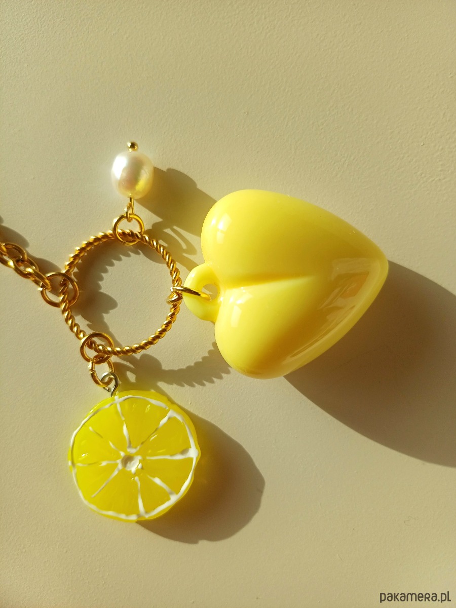 W roli głównej serce wykonane z akrylu oraz cytrynka, perła naturalna jako delikatny akcent.