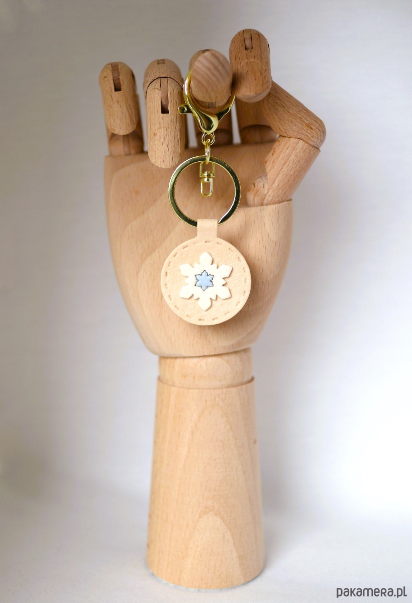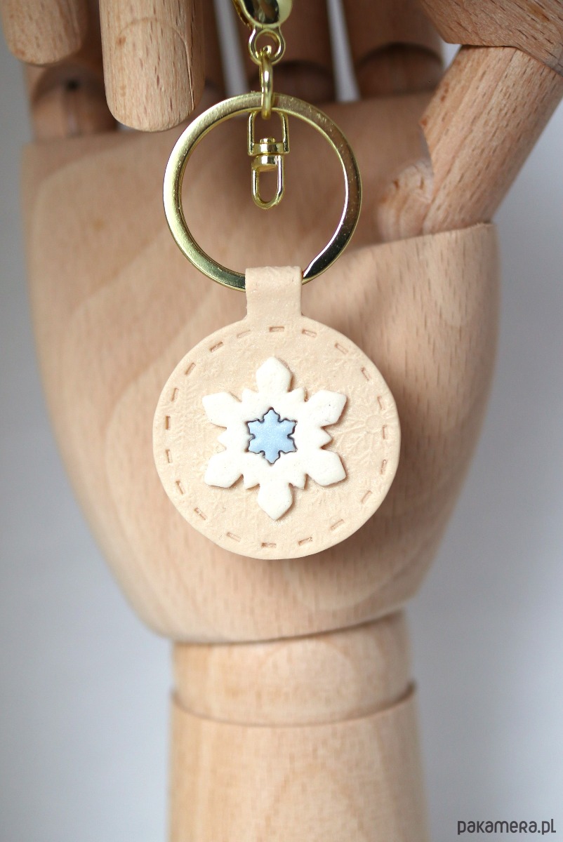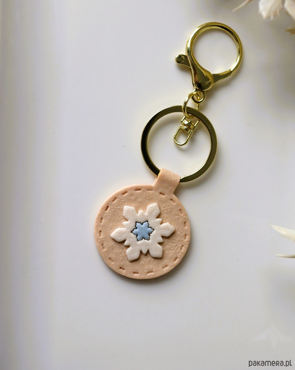 Brelok, w klasycznym okrągłym kształcie, i delikatnym pastelowokremowym kolorze, ze śliczną śnieżynką