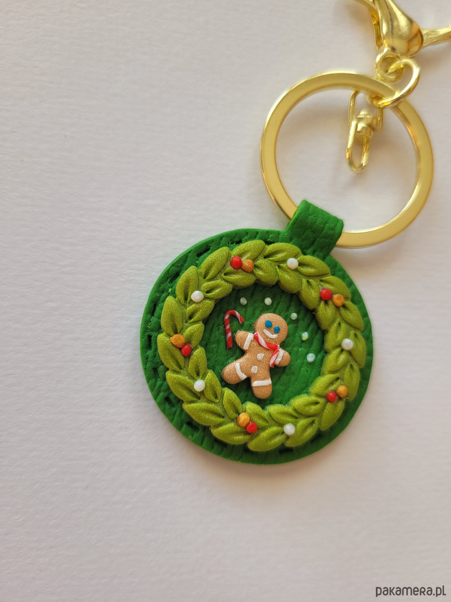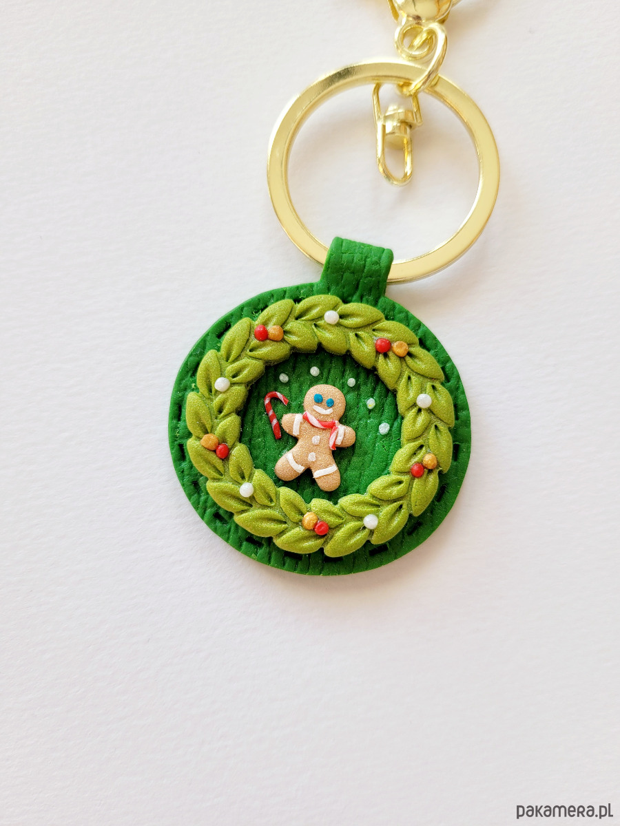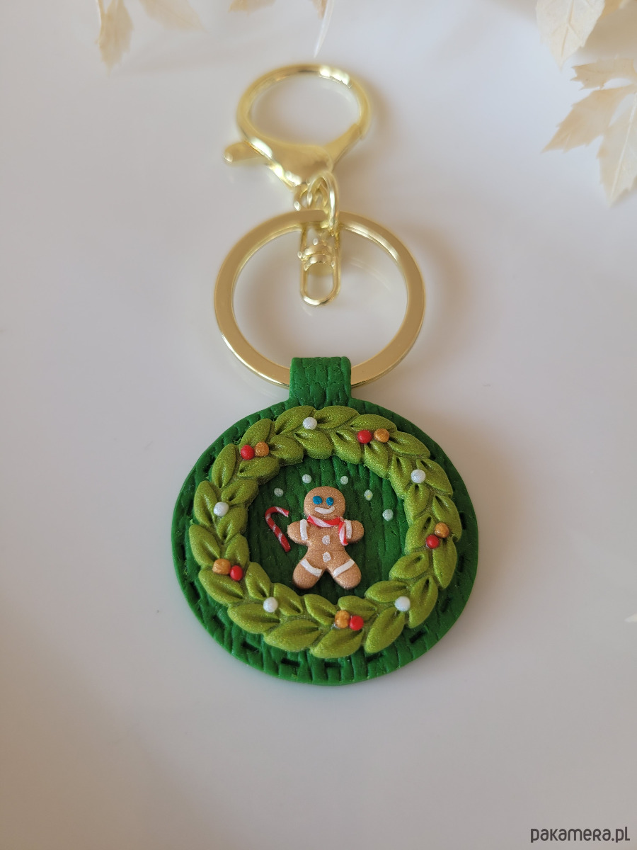 Sympatyczny brelok, w kształcie koła, z motywem świątecznego piernikowego ludzika