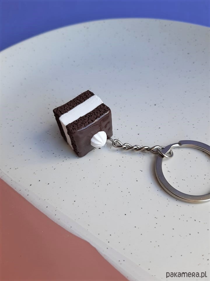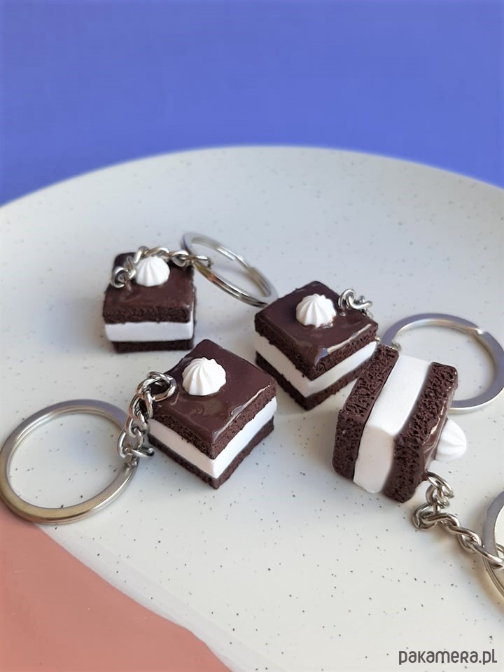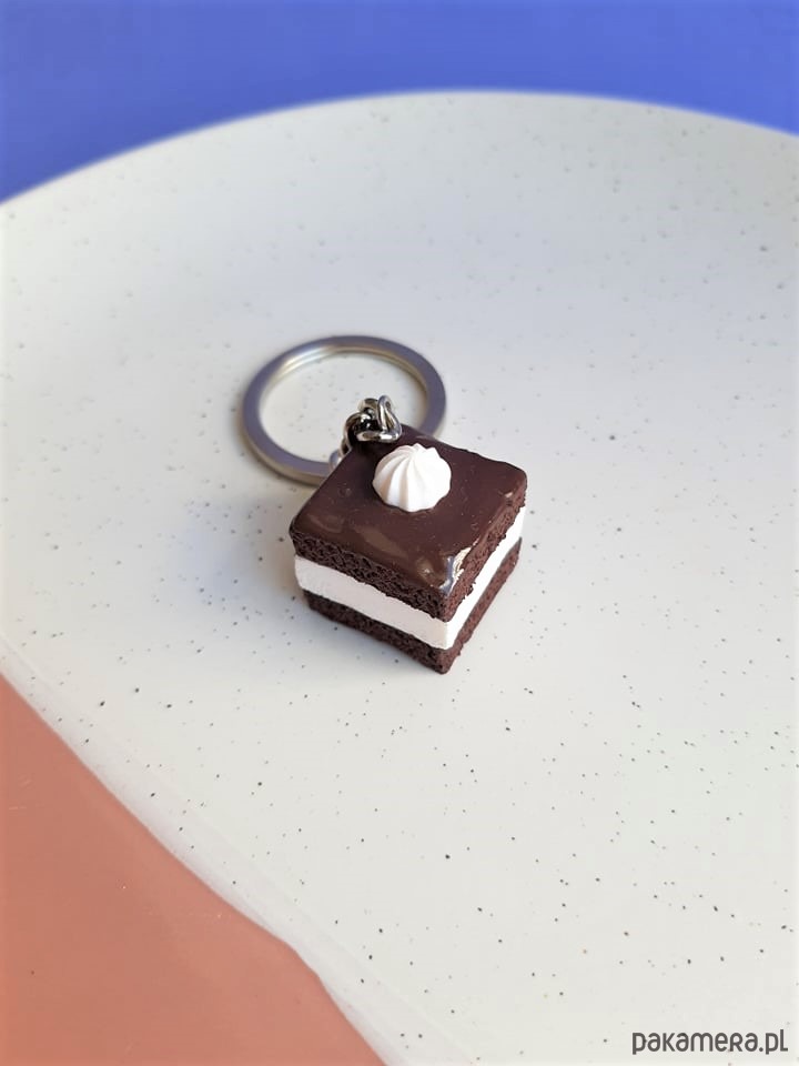 Słodki brelok przypominający do złudzenia prawdziwe ciasto Wuzetka wykonany z masy plastycznej (Modeliny). Po wypieczeniu modelina staje się bardzo wytrzymała.