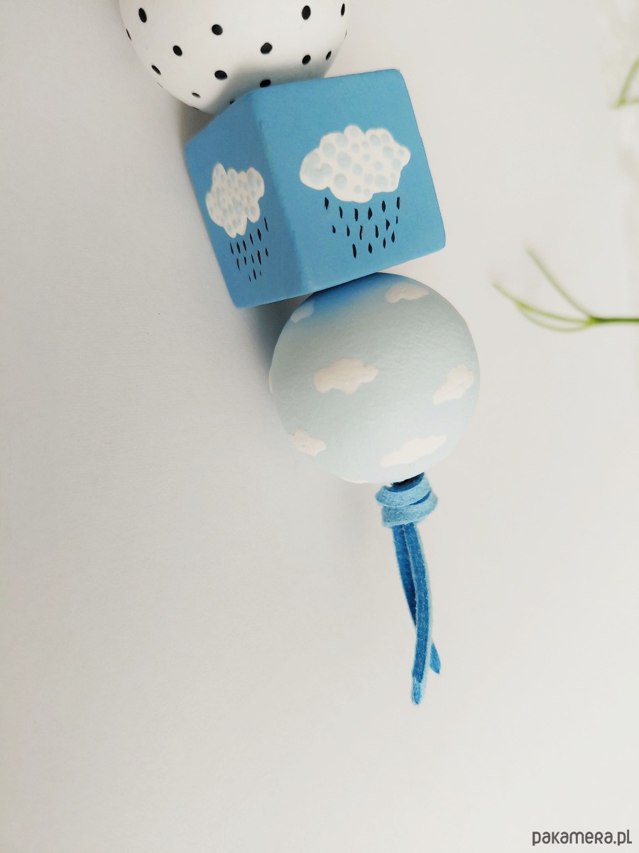 Brelok wykonany z elementów drewnianych malowanych i zabezpieczonych lakierem.