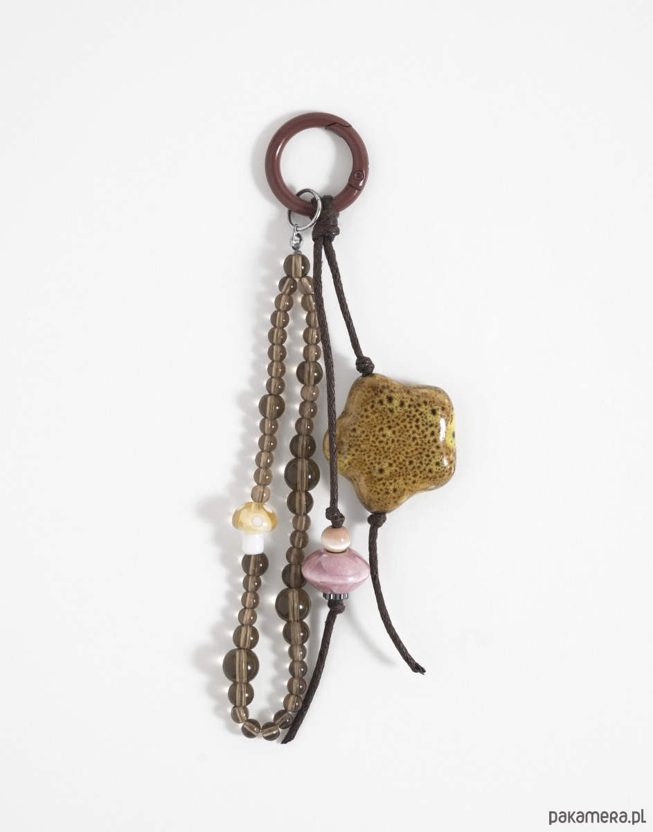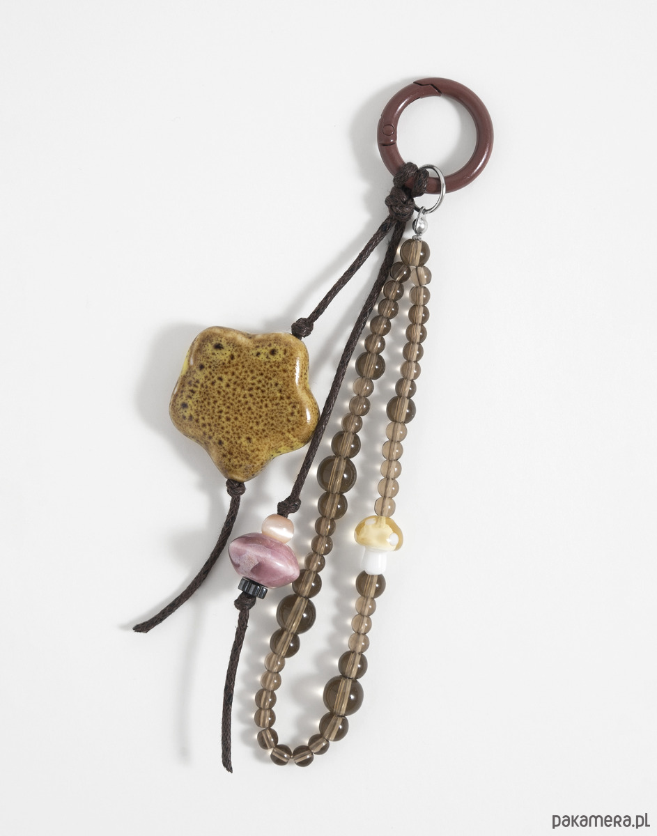 Brelok do torebki, plecaka lub kluczy wykonany ręcznie z połączenia koralików szklanych, kamieni naturalnych oraz elementów ceramicznych. To drobiazg, który nie tylko przyciąga wzrok, ale też pięknie dopełni Twoje stylizacje.