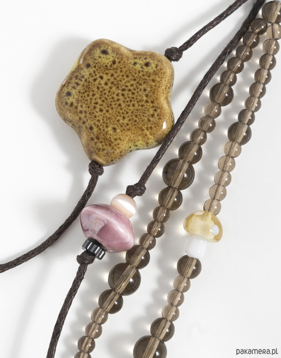 • Druga część to kompozycja koralików ceramicznych i kamieni naturalnych, nawleczonych na rzemień naturalny. Wyrazistym akcentem jest duży ceramiczny koralik w kształcie kwiatka w odcieniach musztardowo-brązowych, który przyciąga uwagę i nadaje całości niepowtarzalny styl.