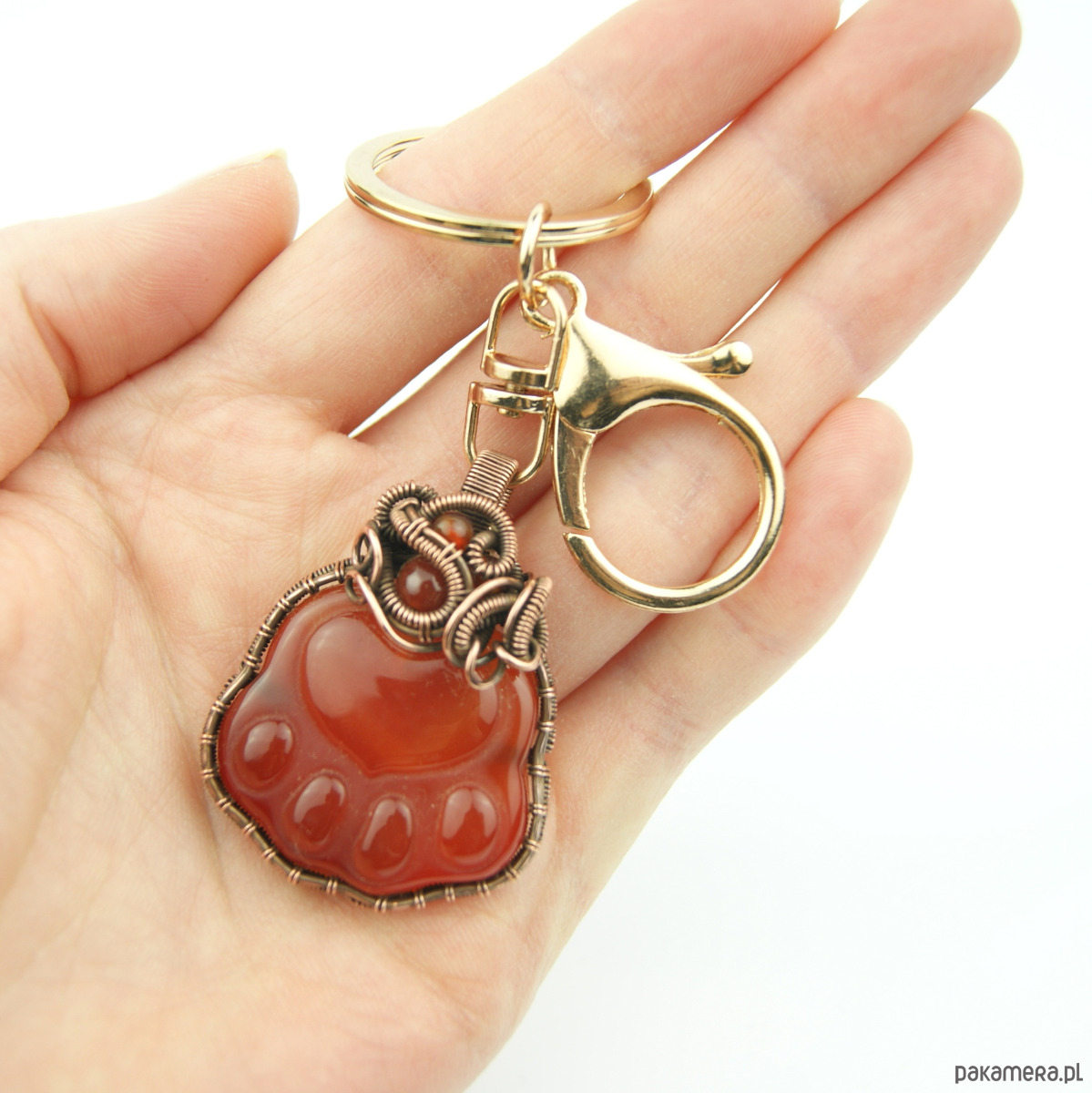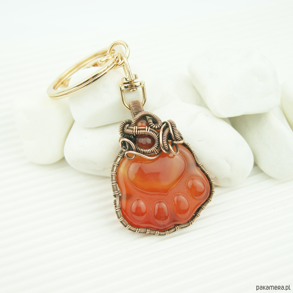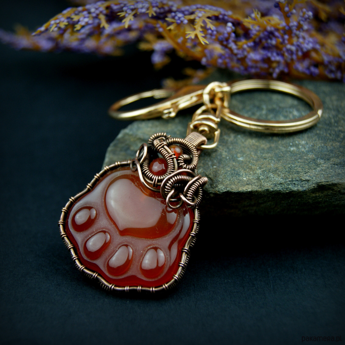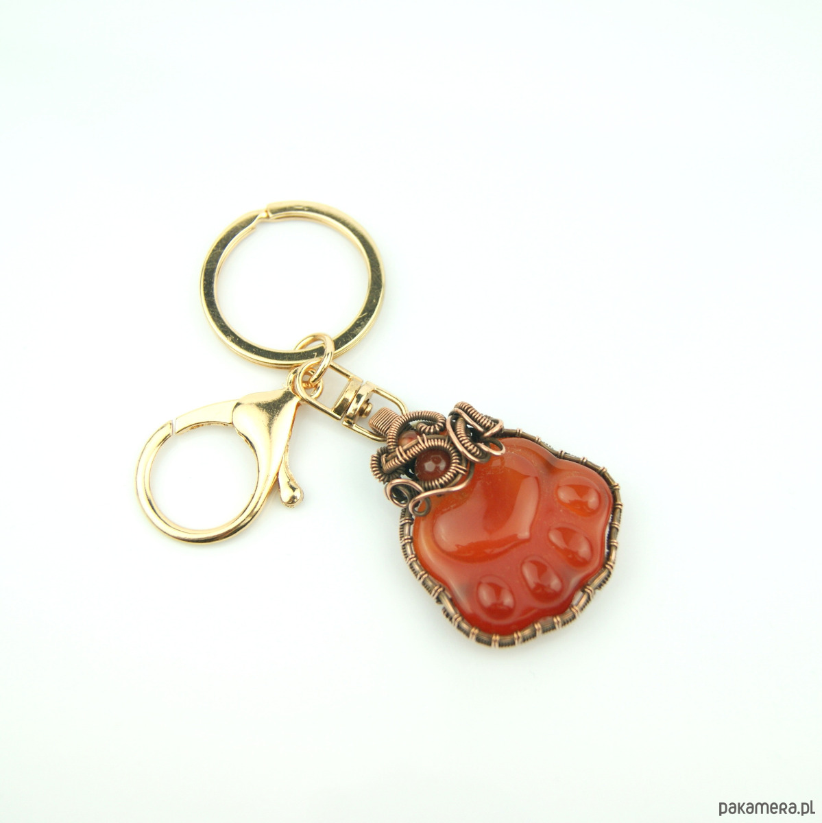 Brelok jedyny w swoim rodzaju, wykonany w pracochłonnej technice wire wrapping. Podstawę breloka stanowi kamień karneol rzeźbiony w kształt psiej/ kociej łapki. Kamień wzbogacony misternym oplotem z miedzi. Brelok posiada tradycyjne kółko oraz duży karabińczyk - możliwość odczepienia poszczególnych elementów. Idealny na prezent dla miłośników psów i kotów.