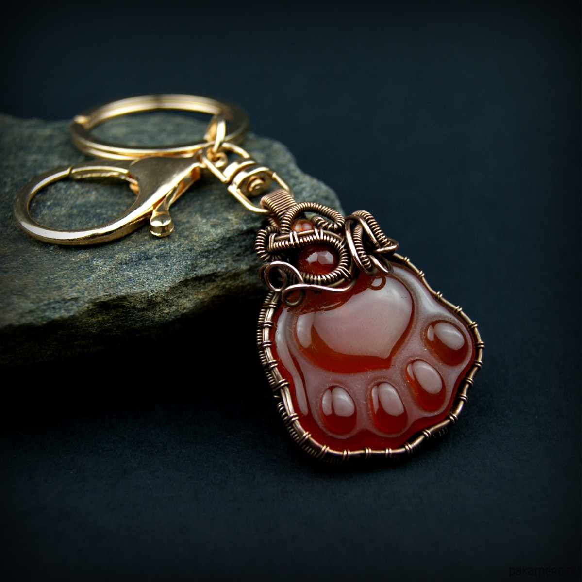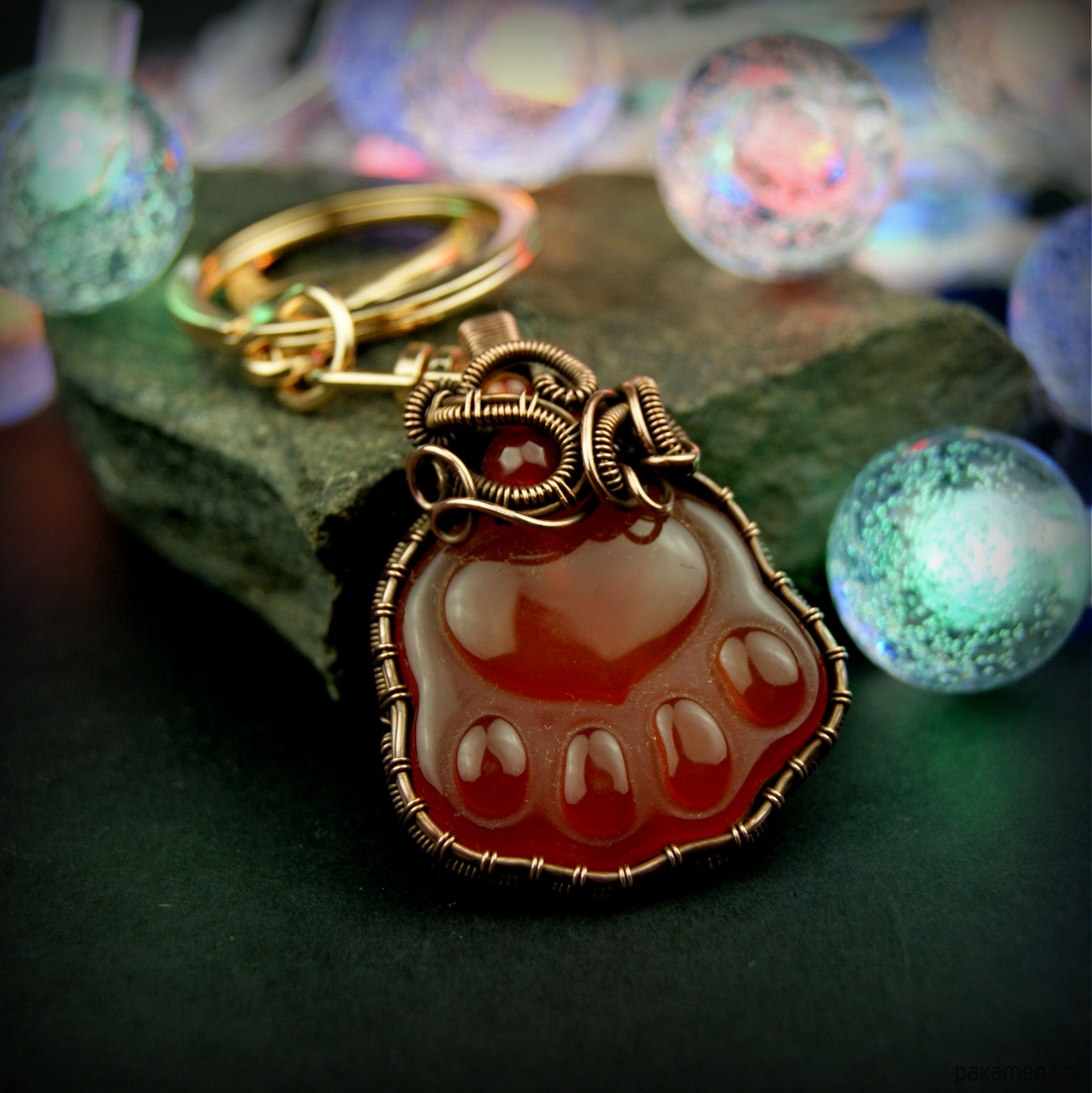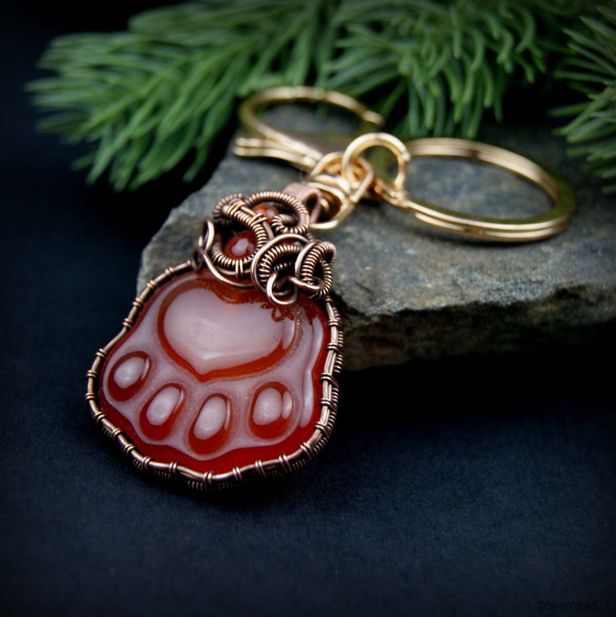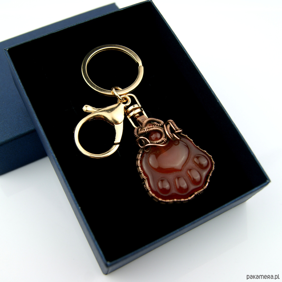 Brelok jedyny w swoim rodzaju, wykonany w pracochłonnej technice wire wrapping. Podstawę breloka stanowi kamień karneol rzeźbiony w kształt psiej/ kociej łapki. Kamień wzbogacony misternym oplotem z miedzi. Brelok posiada tradycyjne kółko oraz duży karabińczyk - możliwość odczepienia poszczególnych elementów. Idealny na prezent dla miłośników psów i kotów.