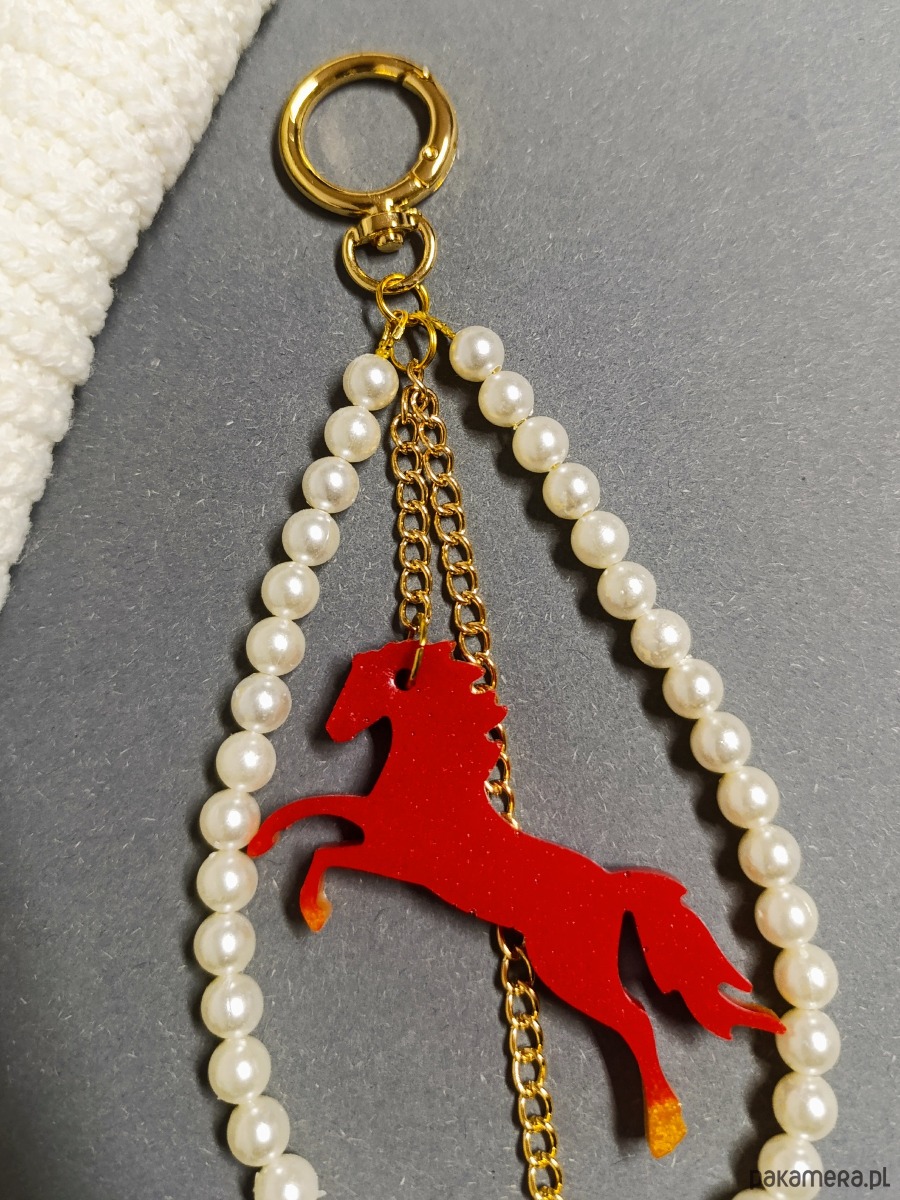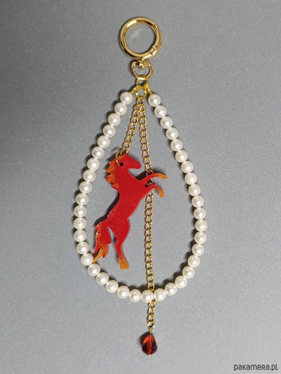 Przyciągnij szczęście i pozytywną energię w nadchodzącym Roku Konia! Ten wyjątkowy brelok do torebki lub kluczy został wykonany ręcznie z dbałością o każdy detal. W centrum znajduje się czerwony koń — symbol siły, odwagi i niezależności — zawieszony w delikatnej ramce z białych koralików. Całość uzupełnia złoty łańcuszek z drobnym czerwonym akcentem, który dodaje elegancji i charakteru.