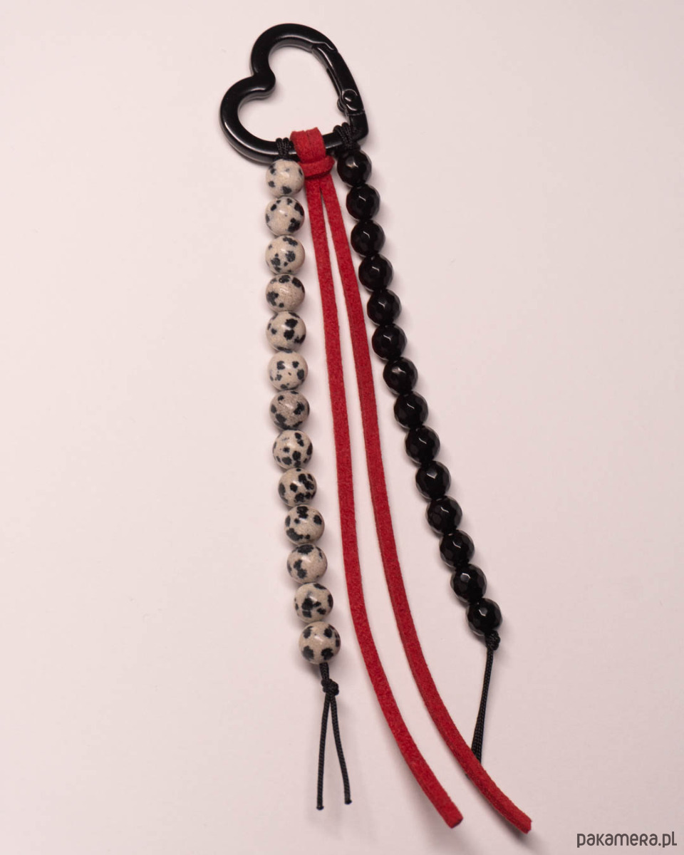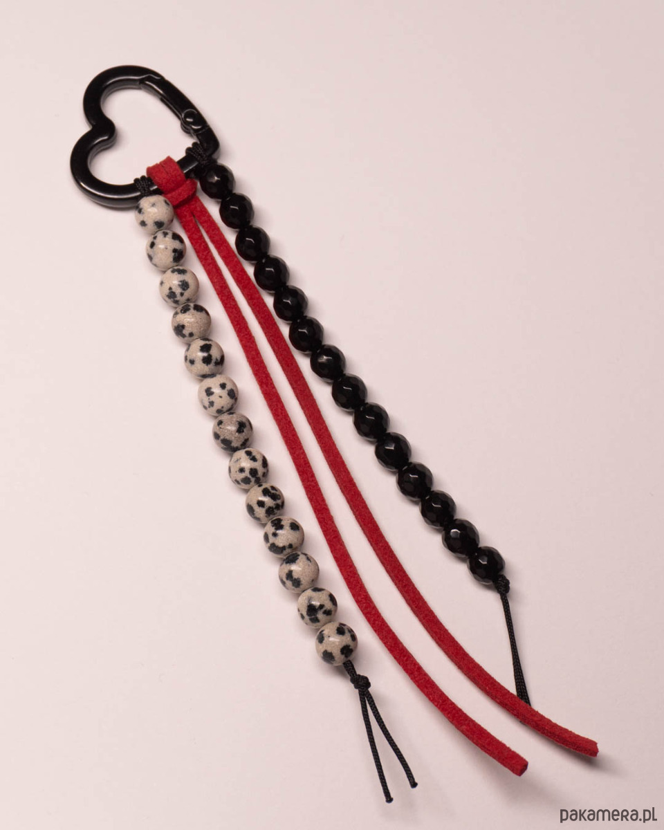 Brelok ozdobny, może służyć jako brelok do kluczy lub zawieszka do torebki. Brelok wykonany z kamieni naturalnych: jaspisu dalmatyńskiego i onyksu, a także z czerwonego rzemienia z imitacji zamszu. Czarny karabińczyk w kształcie serca.
