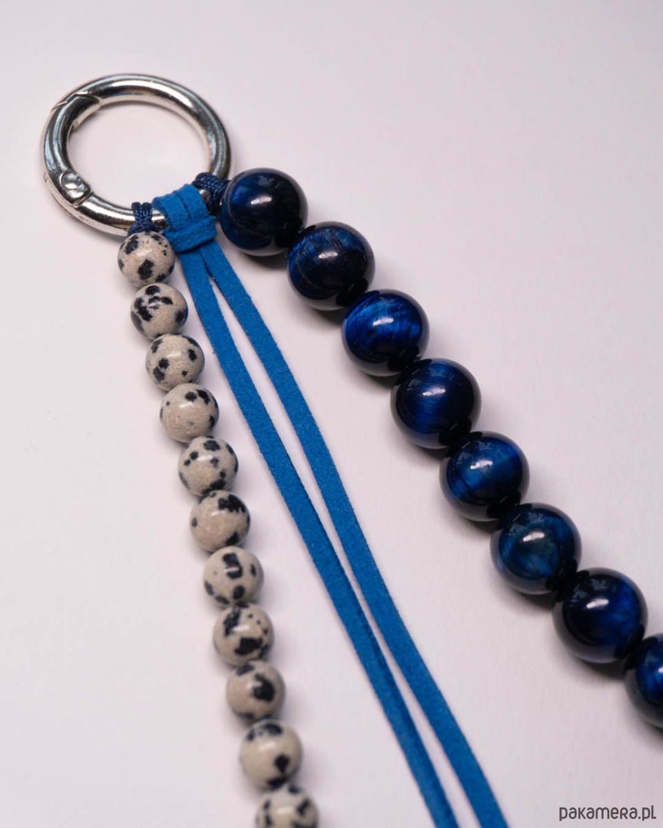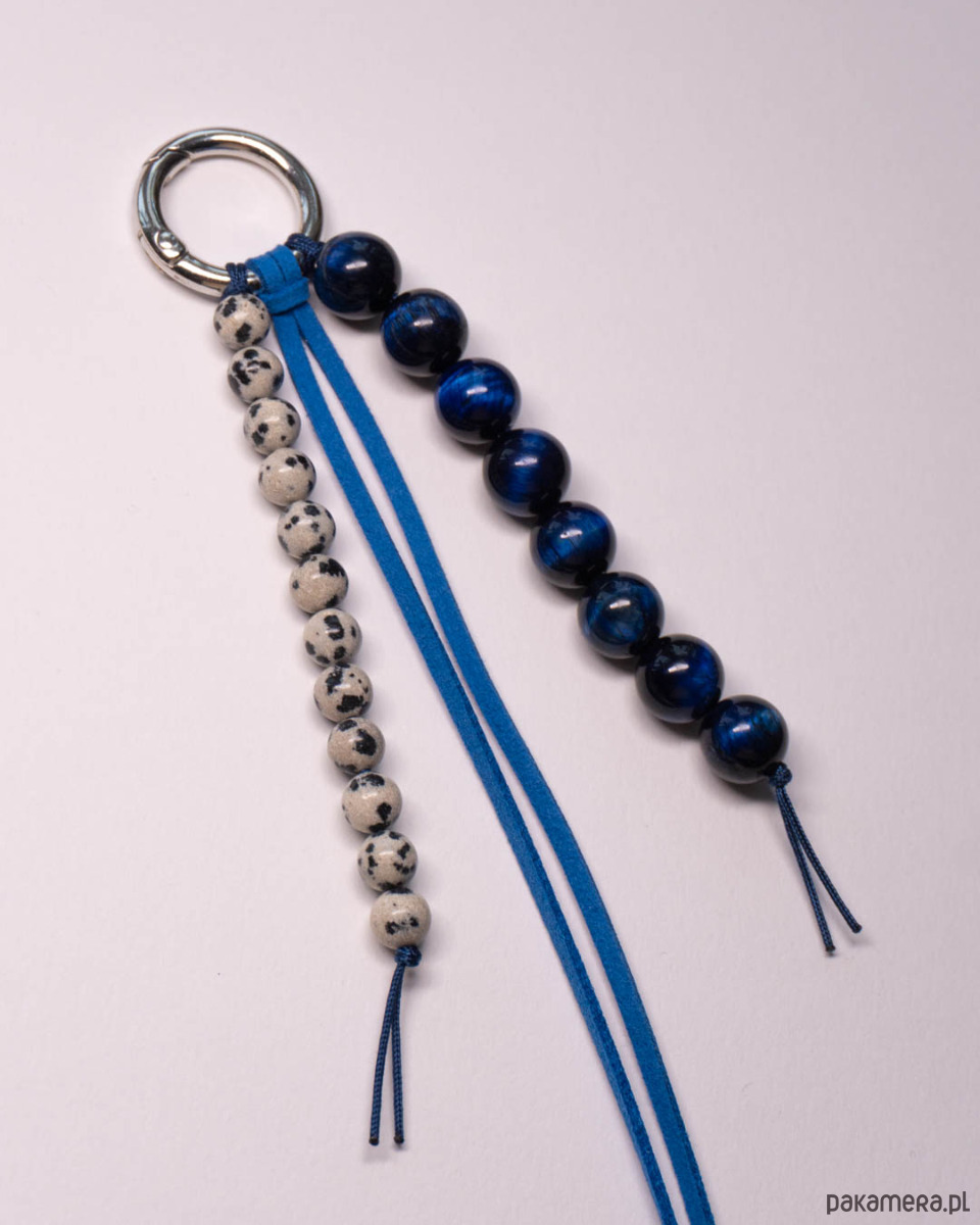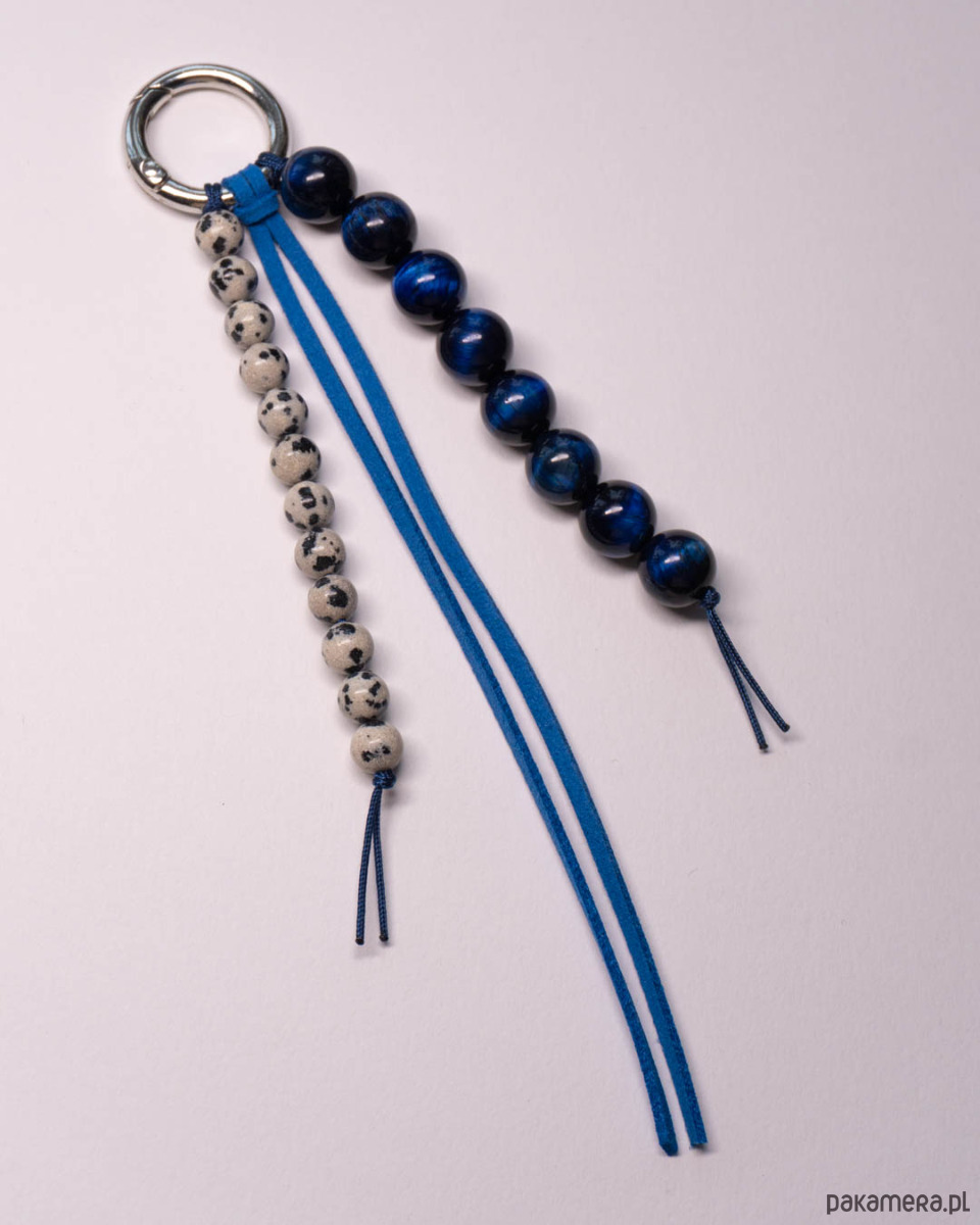 Brelok ozdobny, może służyć jako brelok do kluczy lub zawieszka do torebki. Brelok wykonany z kamieni: jaspisu dalmatyńskiego i tygrysiego oka, a także z niebieskiego rzemienia z imitacji zamszu. Srebrny karabińczyk.