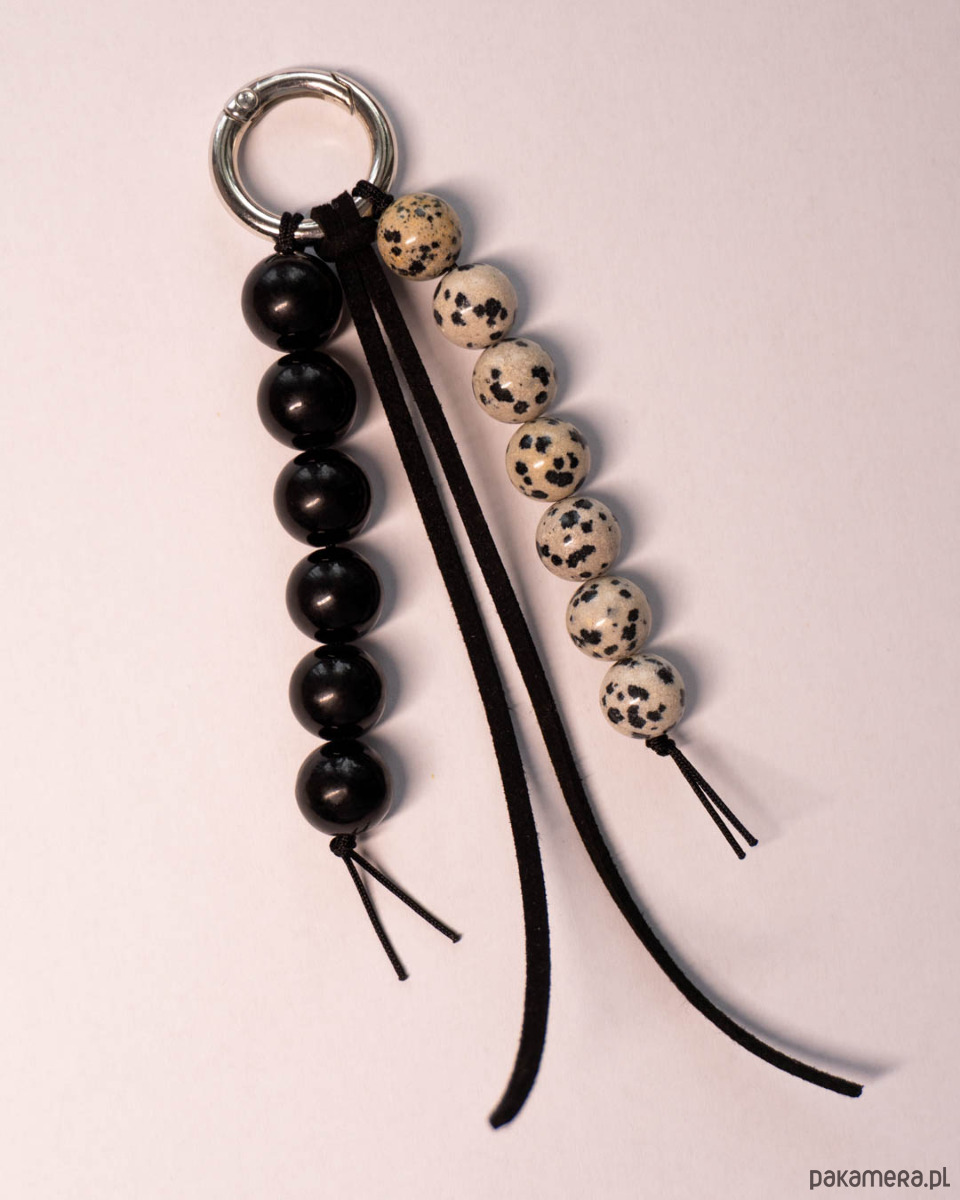 Brelok ozdobny, może służyć jako brelok do kluczy lub zawieszka do torebki. Brelok wykonany z kamieni: jaspisu dalmatyńskiego i marmuru, a także z czarnego rzemienia z imitacji zamszu. Srebrny karabińczyk.