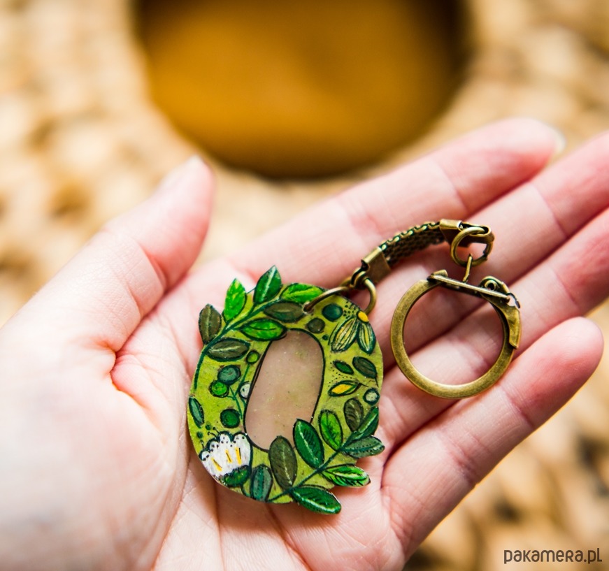 Brelok ręcznie narysowany, kredkami akwarelowymi na termokurczliwej folii, zabezpieczony lakierem ekologicznym. Brelok z obu stron błyszczący i gładki.
