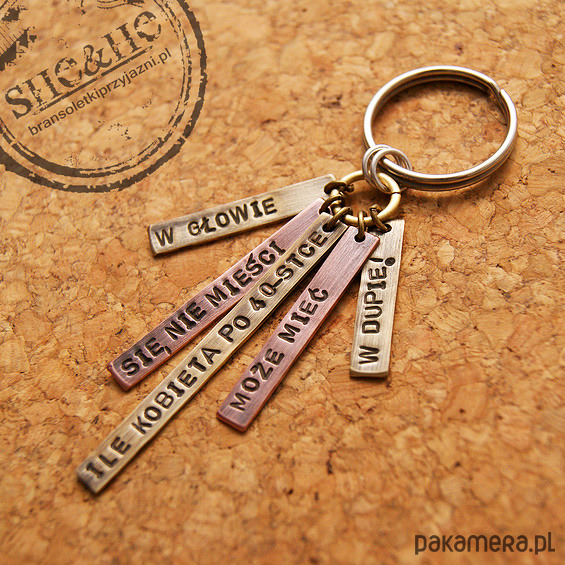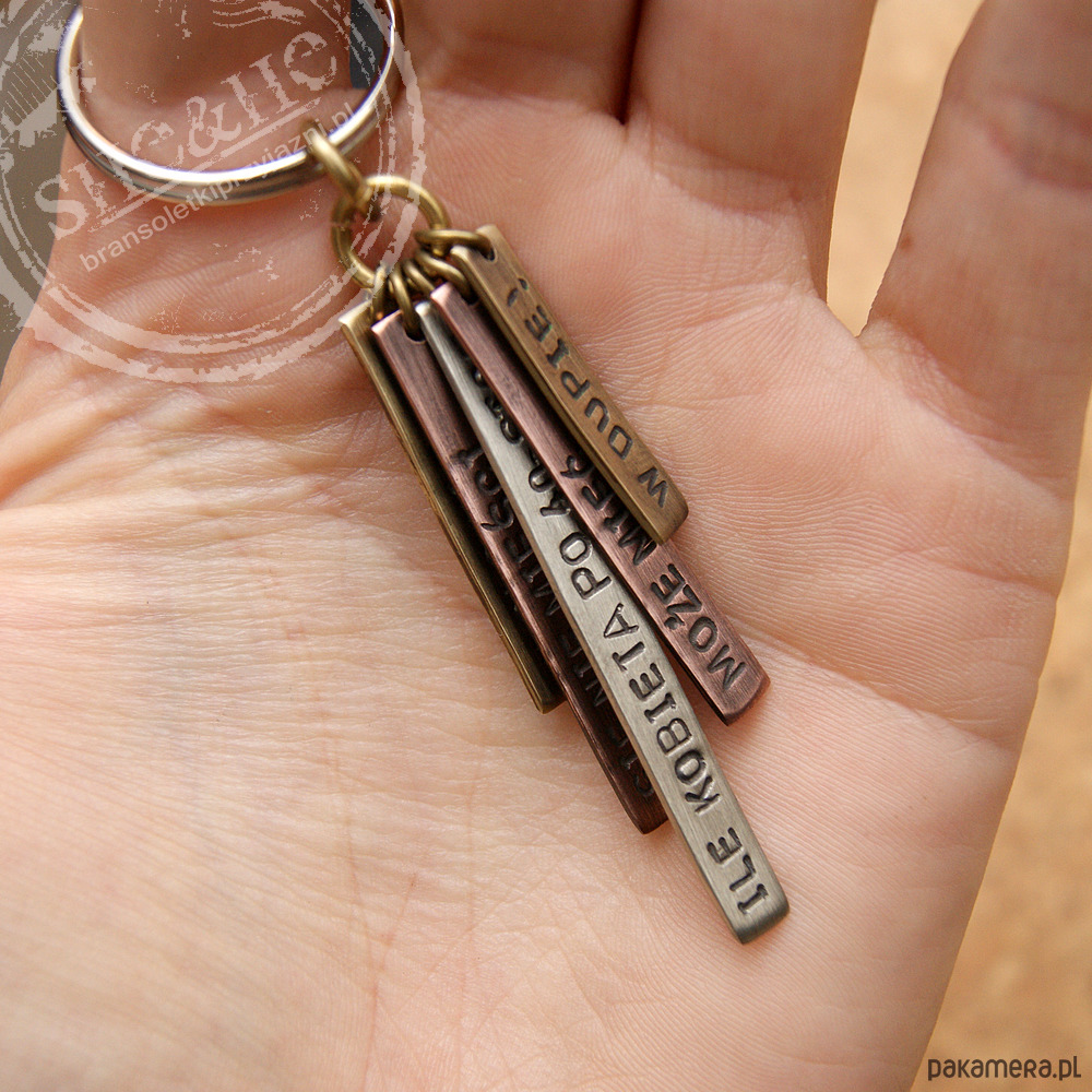 brelok z 5 cioma blaszkami z napisem jak na zdjęciu. Blaszki są z patynowanej miedzi i mosiadzu. ich szerokość to 5 mm a dłiugosc od 2,5 do 5cm