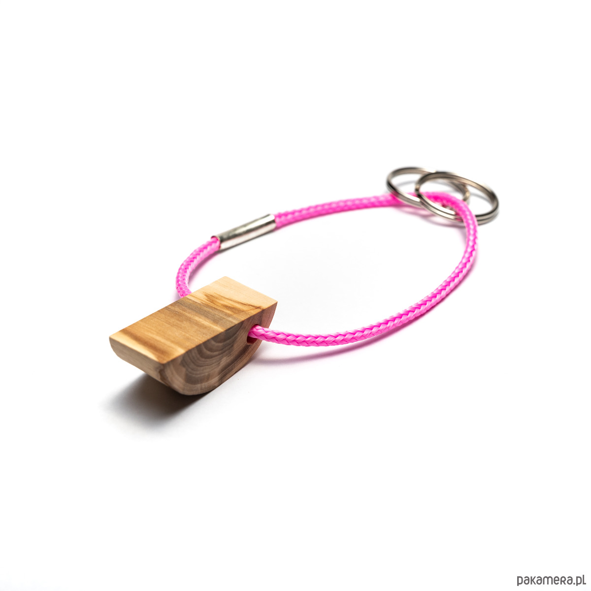 Brelok wykonany z obustronnie polerowanego drewna jabłoni, zawieszony na różowej lince żeglarskiej.