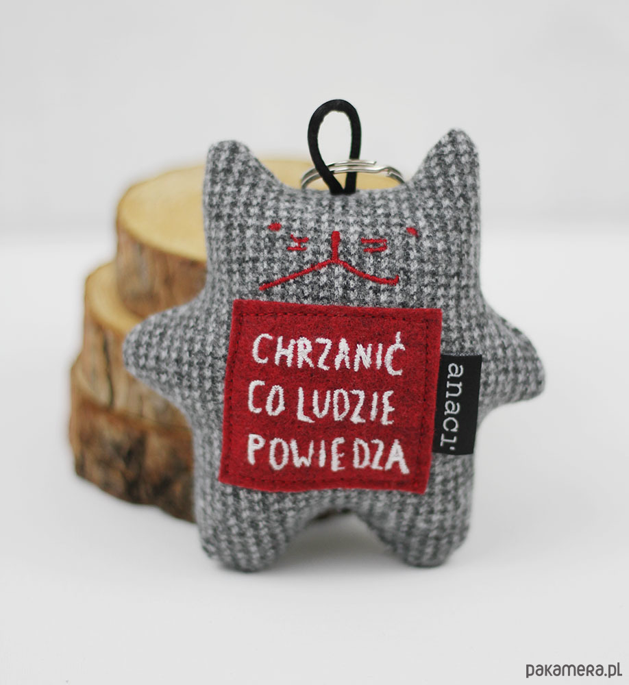Mierzy sobie 11 cm., zaopatrzony w filcową plakietkę z wyhaftowaną deklaracją. Robi swoje.