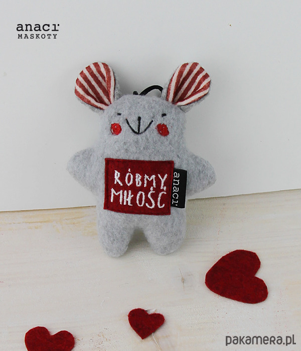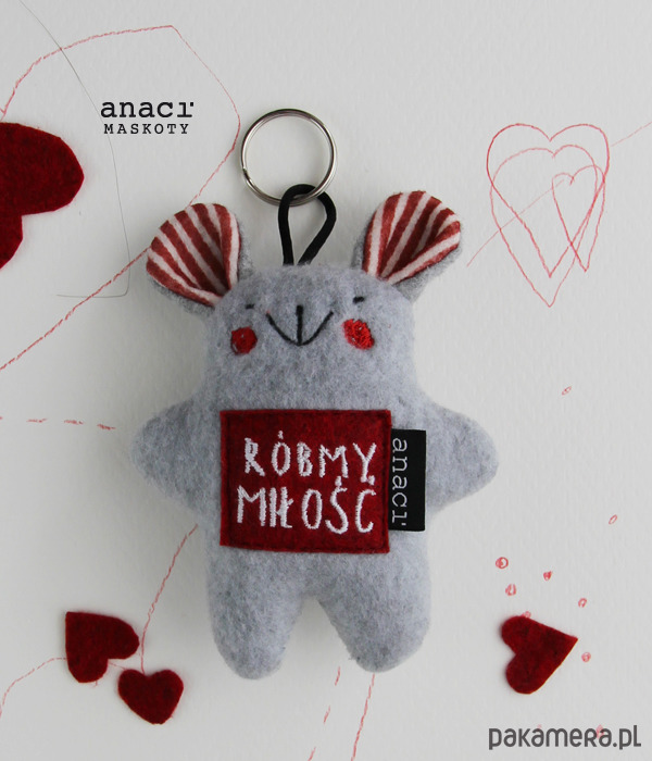 Maskot został uszyty z dzianiny, wypchany włókniną, zaopatrzony w filcową plakietkę z wyhaftowanym hasłem. Mierzy sobie , razem z uszami 10,5 cm.