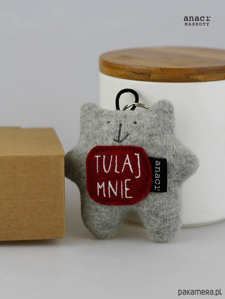 Mierzy sobie blisko 10,5 cm., uszyty z dzianiny wełnianej, wypchany włókniną, zaopatrzony w filcową plakietkę z wyhaftowaną dedykacją.