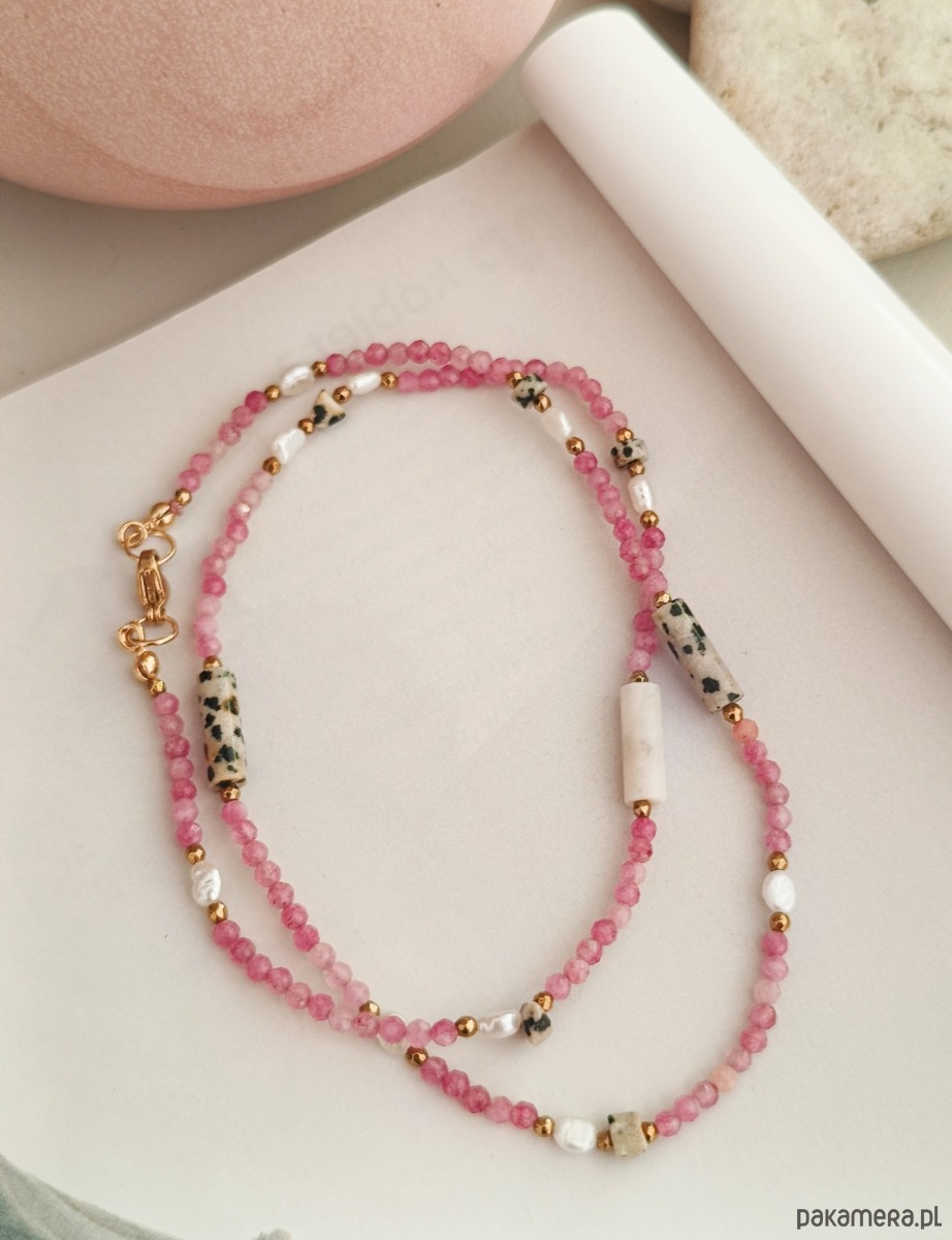 Naszyjnik z naturalnych turmalinów,jaspisu ,agatów i słodkowodnych perełek ze złotymi fasetowanymi hematytami na nici jedwabnej i z wykończeniami ze stali chirurgicznej..Dlugość 48cm.