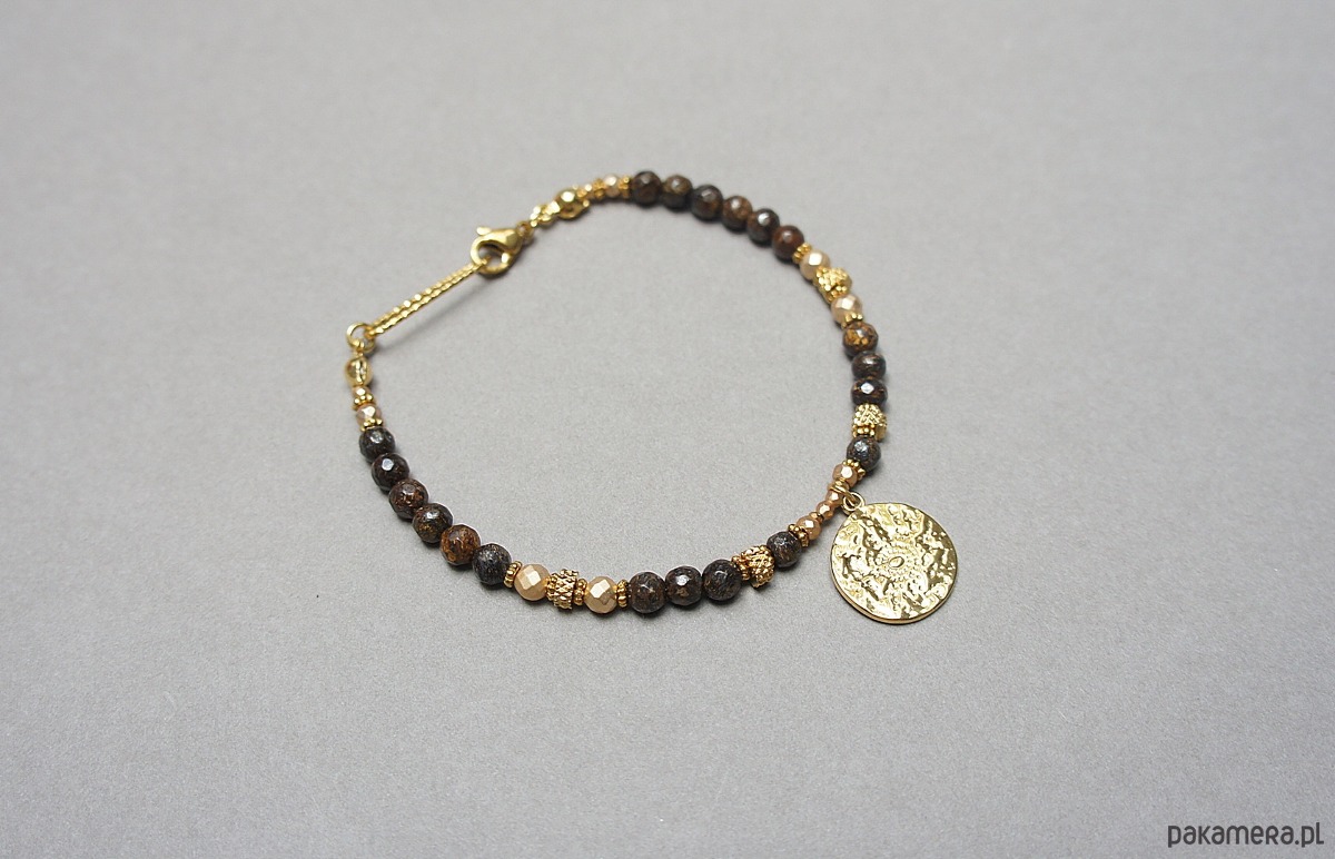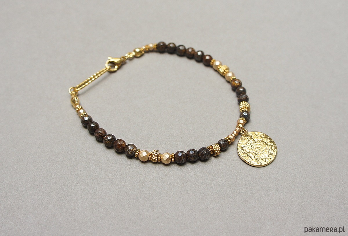 Bransoletka wykonana w całości z pozłacanej stali szlachetnej oraz naturalnych kamieni - kuleczki fasetowane bronzytu [4mm], przekładek z hematytu [1mm], fasetowanych, platerowanych hematytów [4mm, 3mm i 2mm]. Całkowita długość bransoletki Do kompletu można dokupić naszyjnik przedstawiony na zdjęciach.