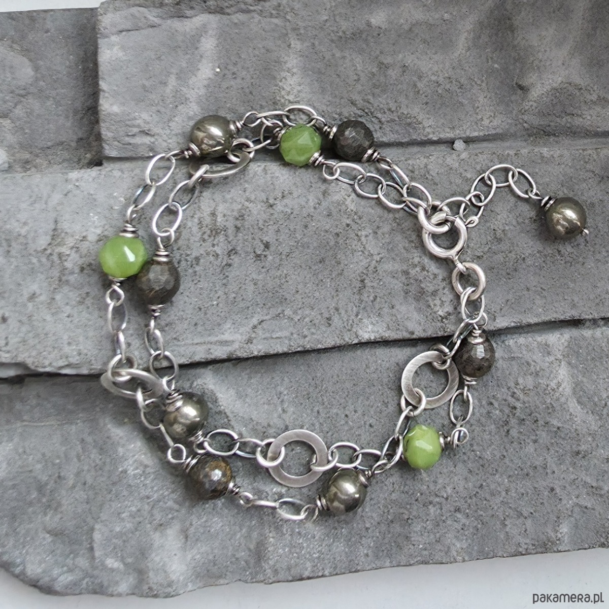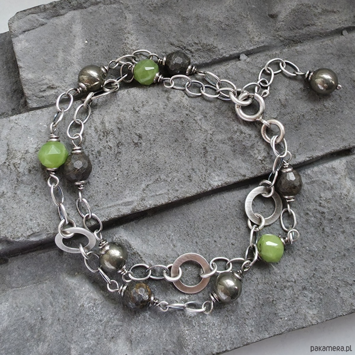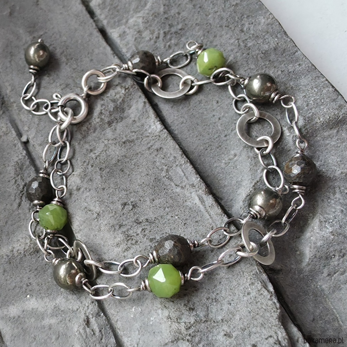 Subtelna i kobieca bransoletka na co dzień. Wykonana w całości z oksydowanego srebra próby 925 oraz kulek nefrytu, bronzytu i pirytu wielkości 6 mm. Całkowita długość bransoletki regulowana od 18 cm do 20 cm. W mojej galerii kolczyki do kompletu. Na życzenie może być nieoksydowana. Ozdobnie zapakowana.