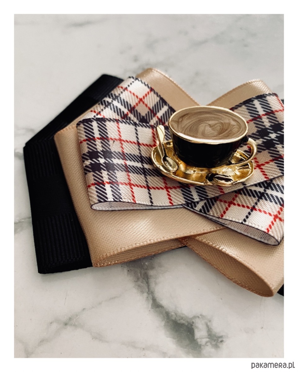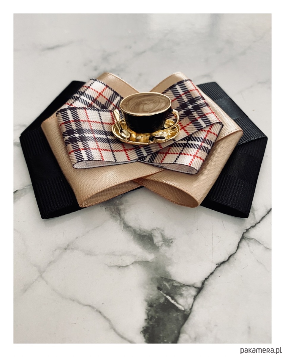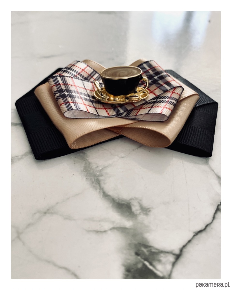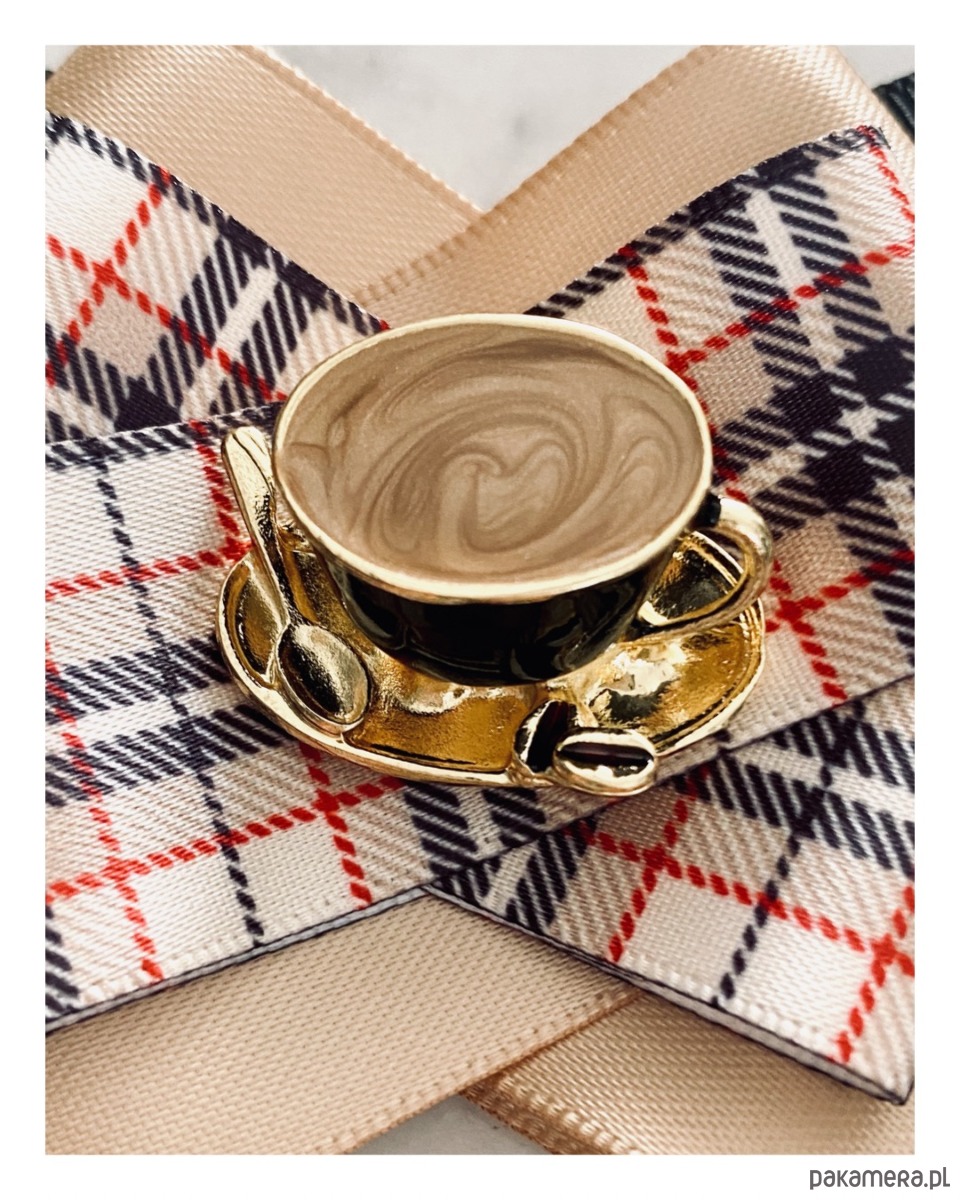 Na środku naszyta cudowna ozdoba biżuteryjna filiżanka kawy z łyżeczką, wszystko w kolorach idealnie pasujących do porannej kawy. Filiżanka jest trójwymiarowa i bardzo klimatyczna.