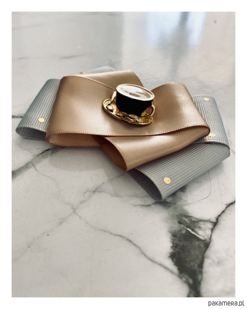 Broszka wykonana z wysokiej jakości taśm i dodatków.