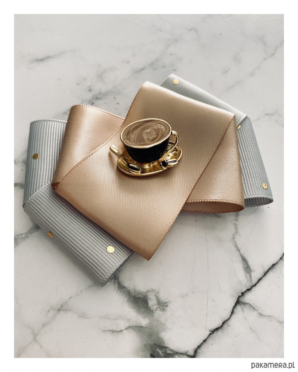 Na środku naszyta cudowna ozdoba biżuteryjna filiżanka kawy z łyżeczką, wszystko w kolorach idealnie pasujących do porannej kawy. Filiżanka jest trójwymiarowa i bardzo klimatyczna.