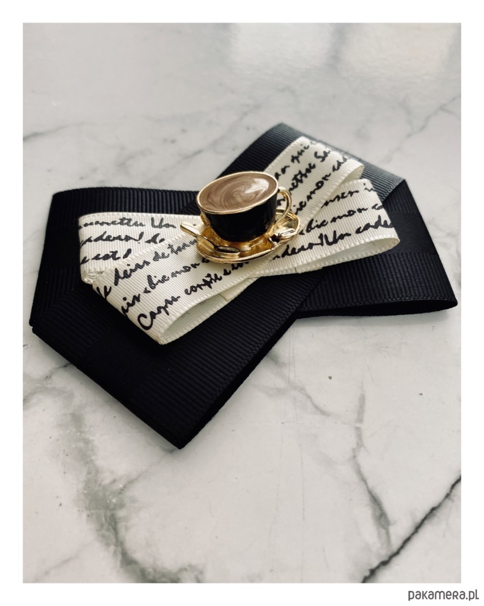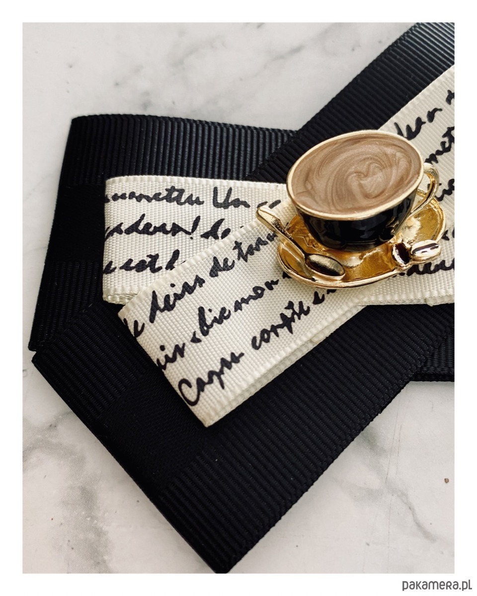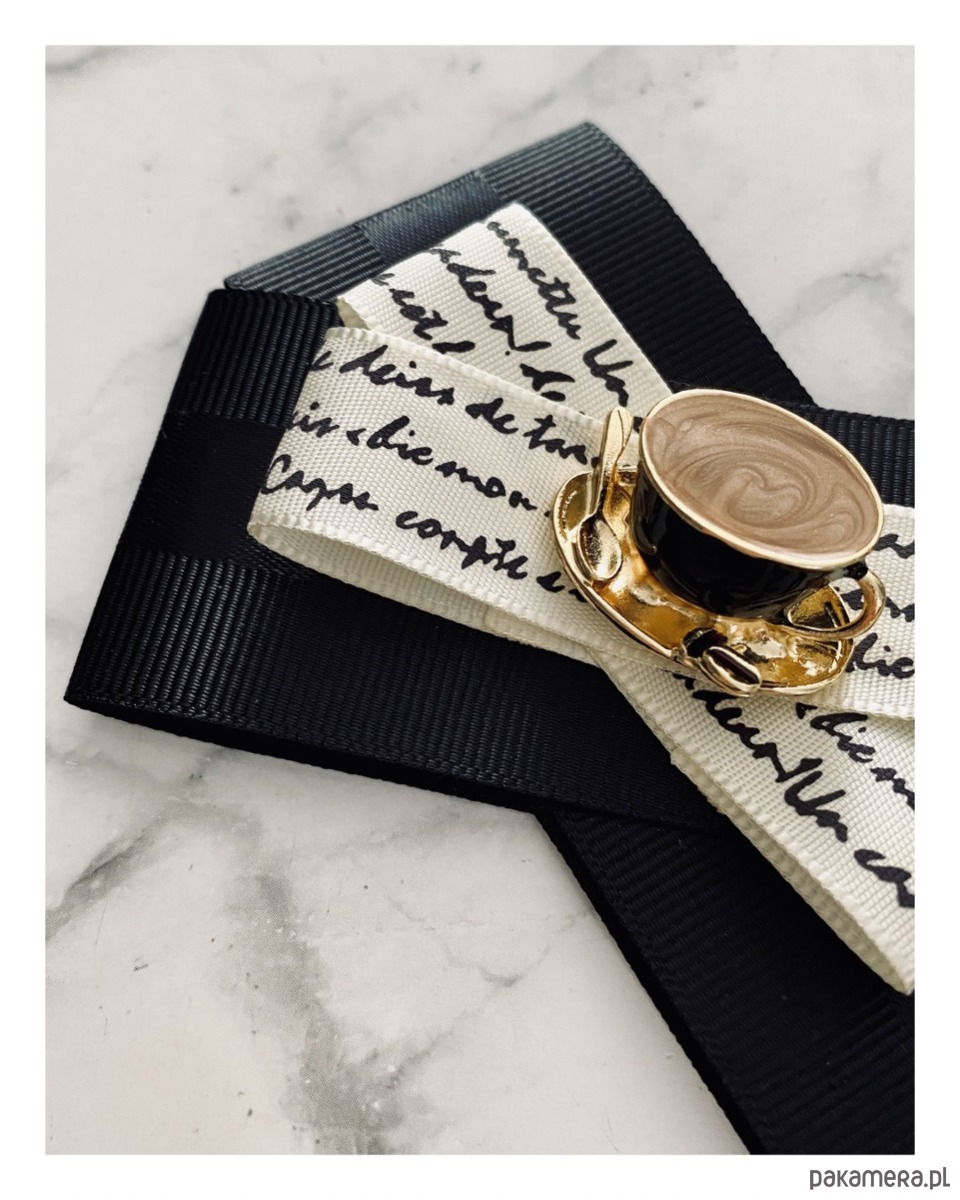 Na środku naszyta cudowna ozdoba biżuteryjna filiżanka kawy z łyżeczką, wszystko w kolorach idealnie pasujących do porannej kawy. Filiżanka jest trójwymiarowa i bardzo klimatyczna.