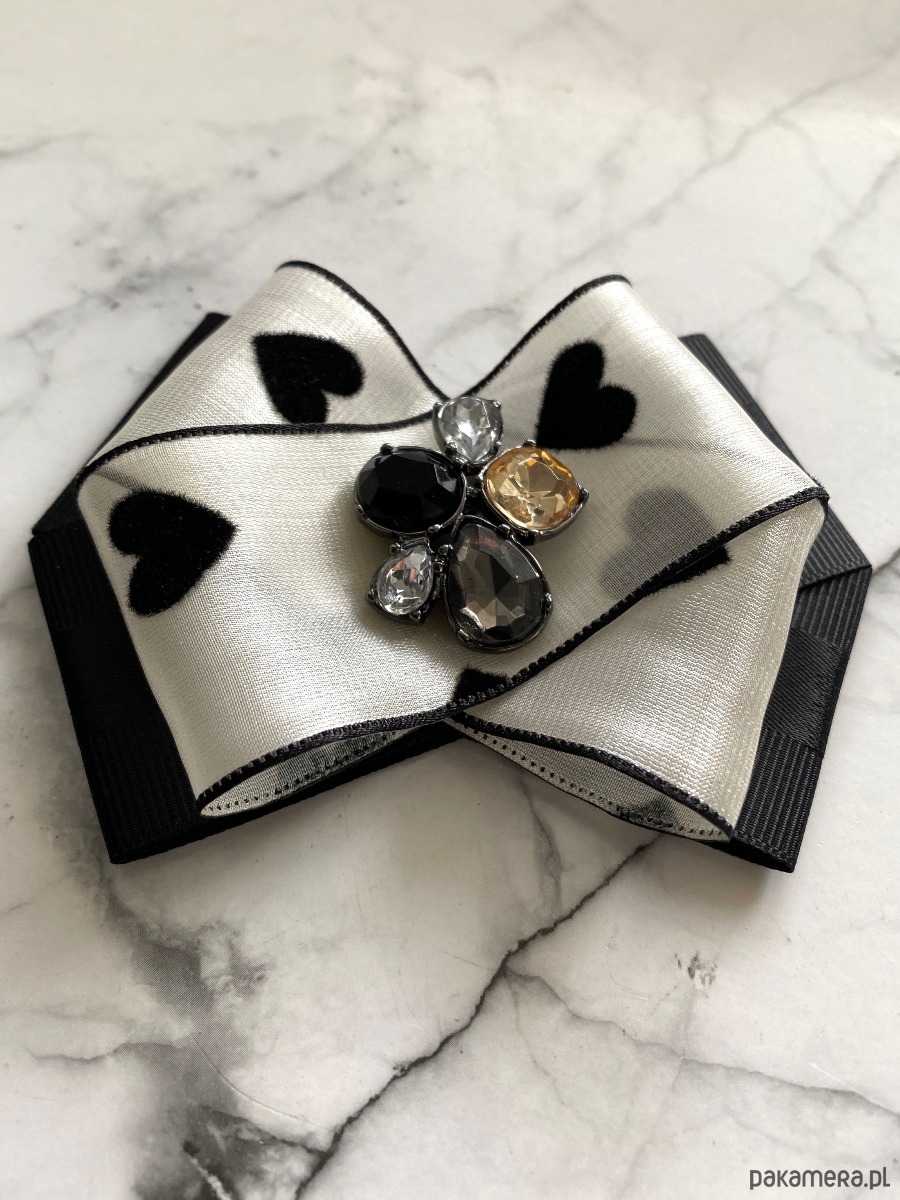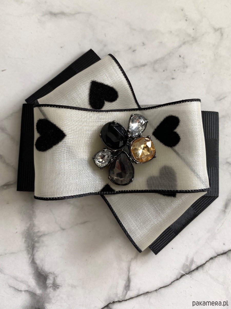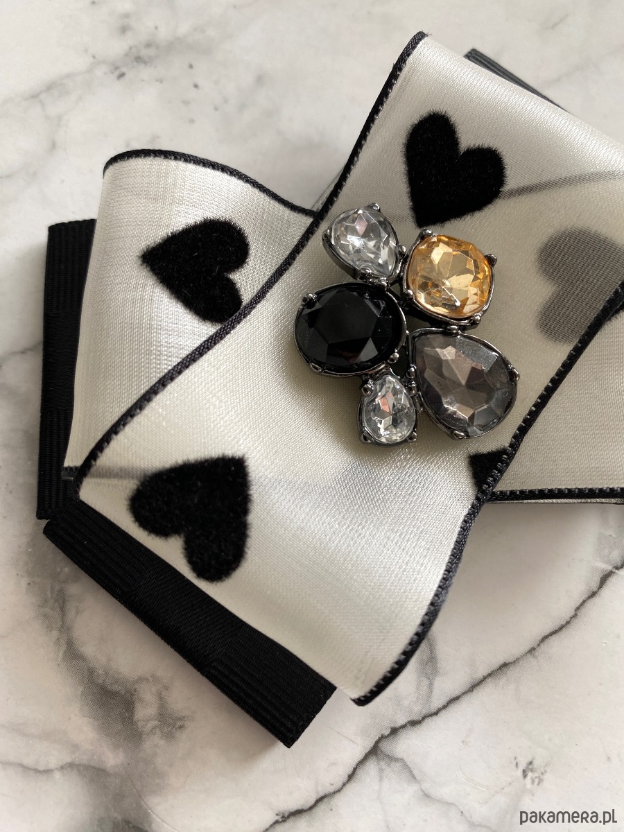 Niezwykle ciekawa delikatna wstążka a’la jedwabna z czarnymi serduszkami dodaje lekkości i kobiecości.