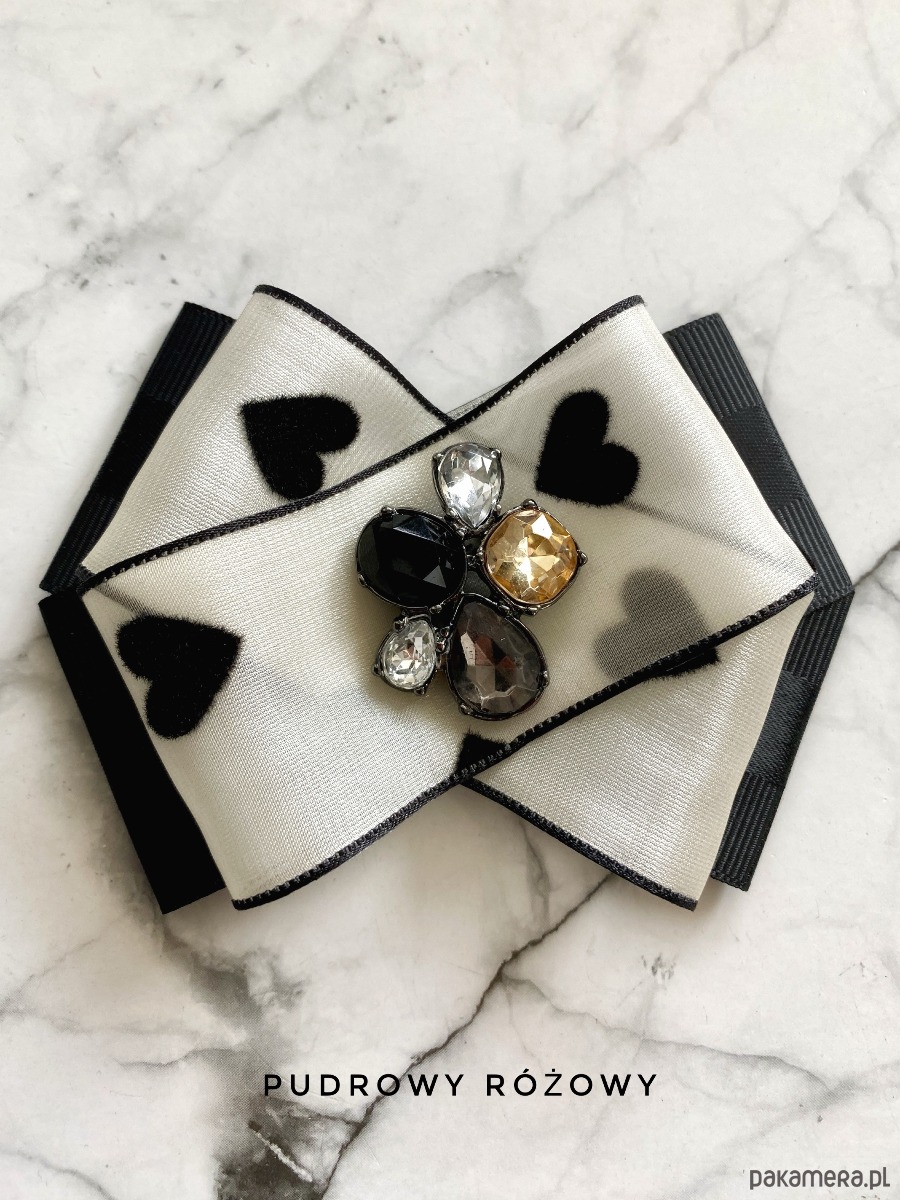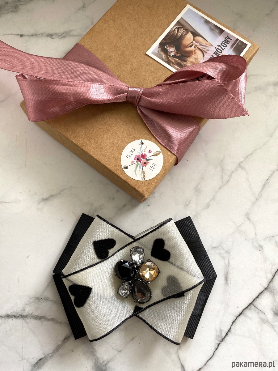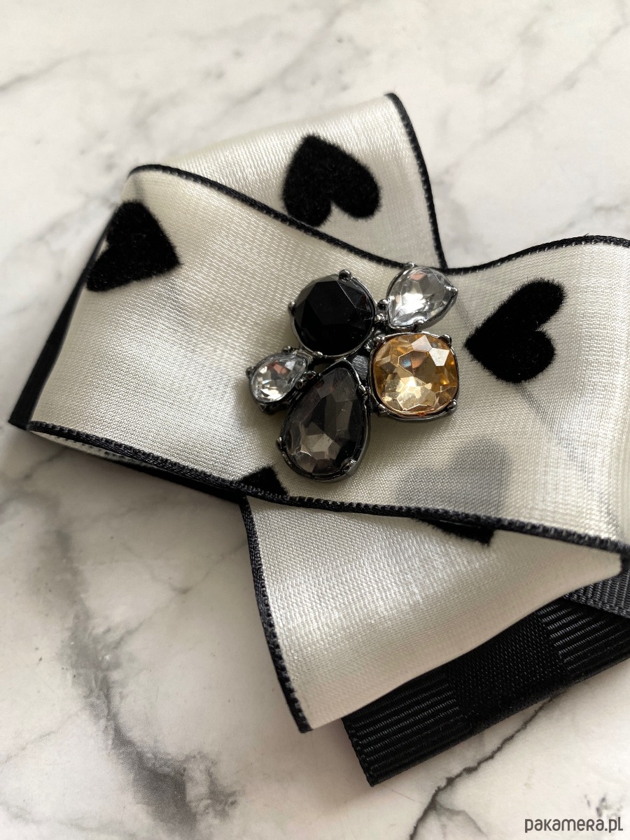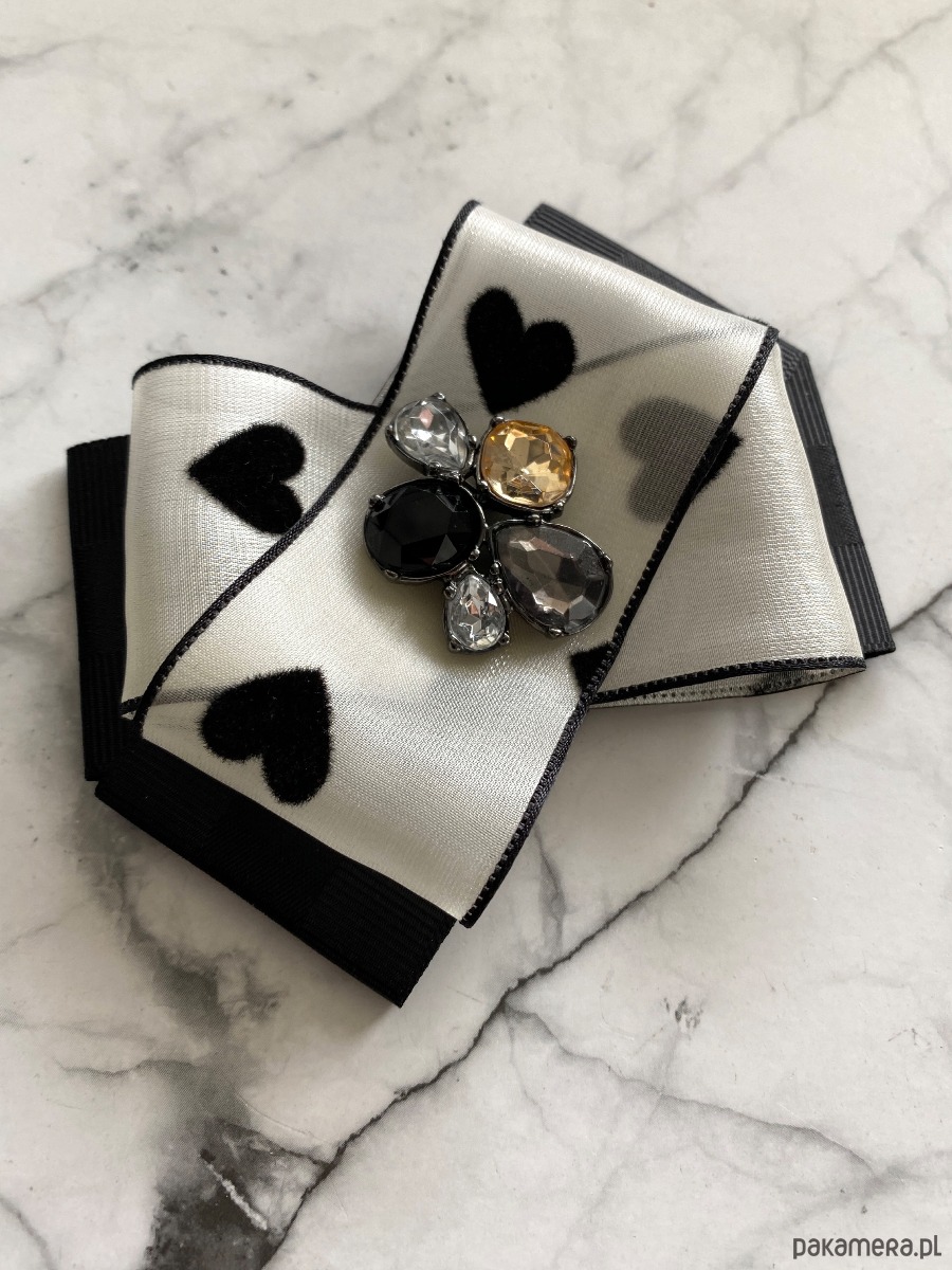 Niezwykle ciekawa delikatna wstążka a’la jedwabna z czarnymi serduszkami dodaje lekkości i kobiecości.