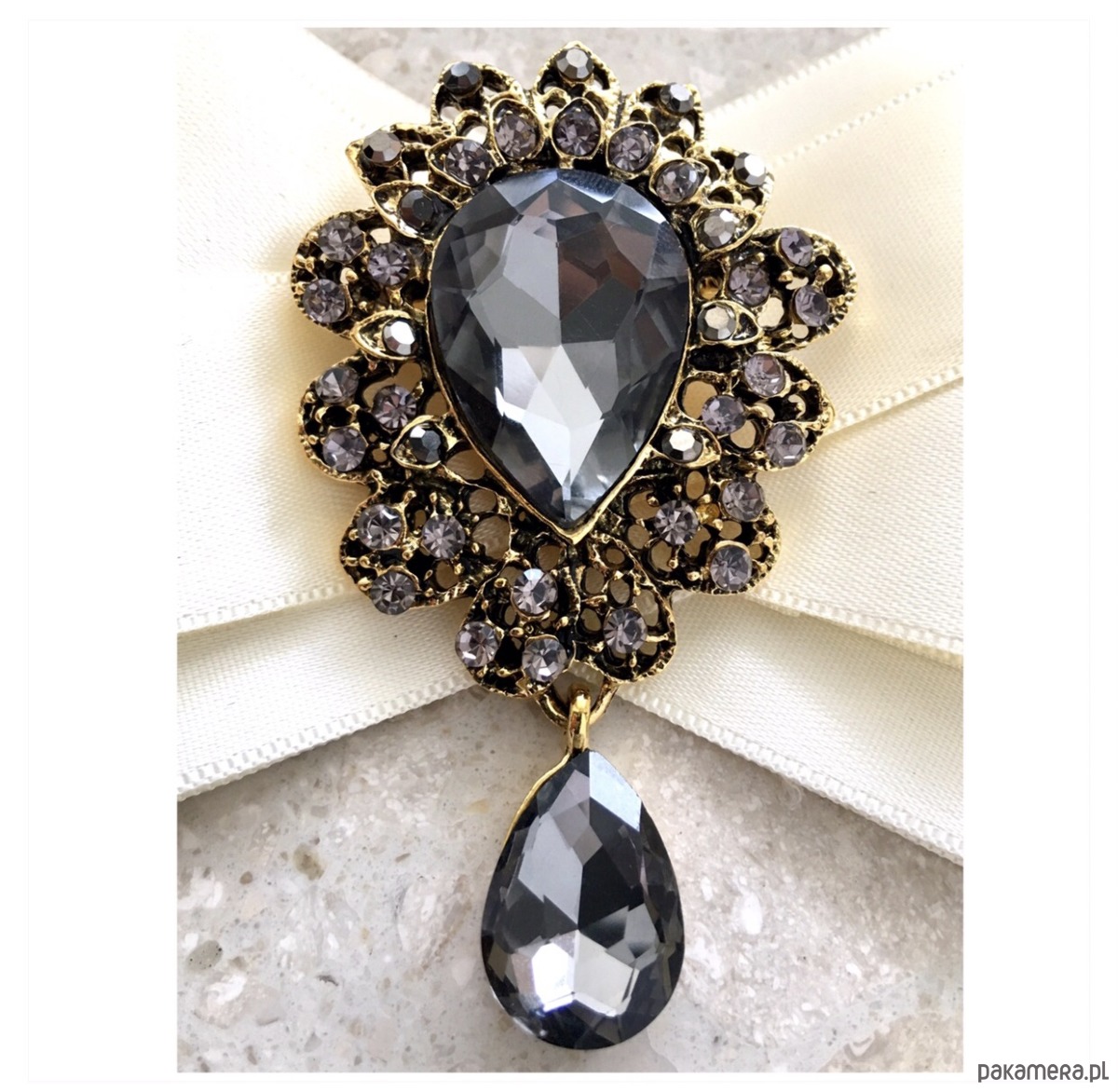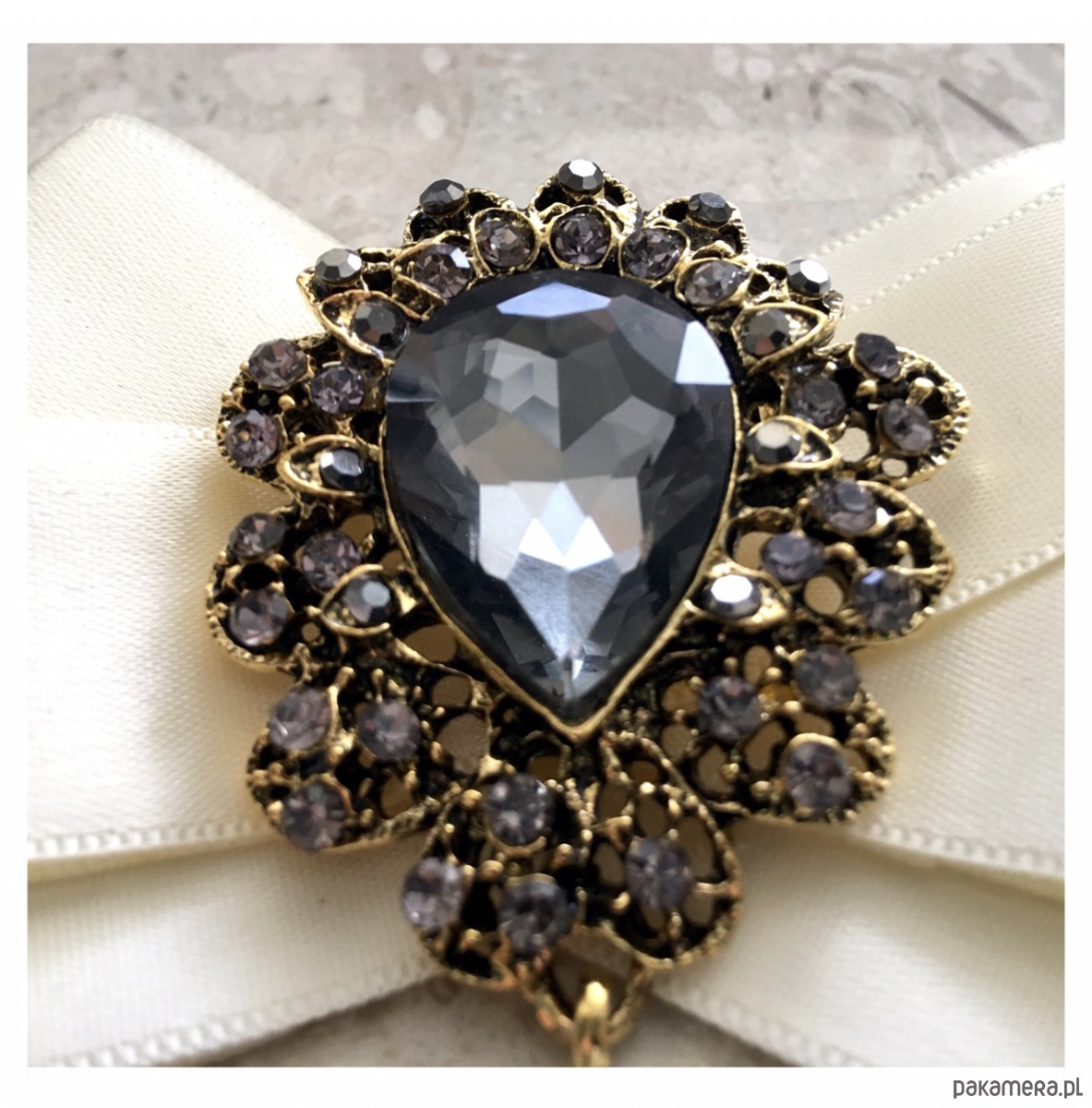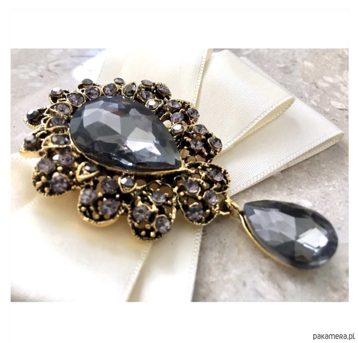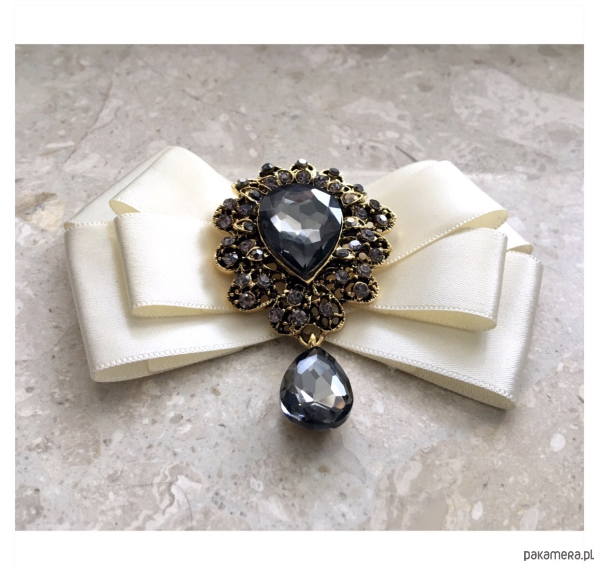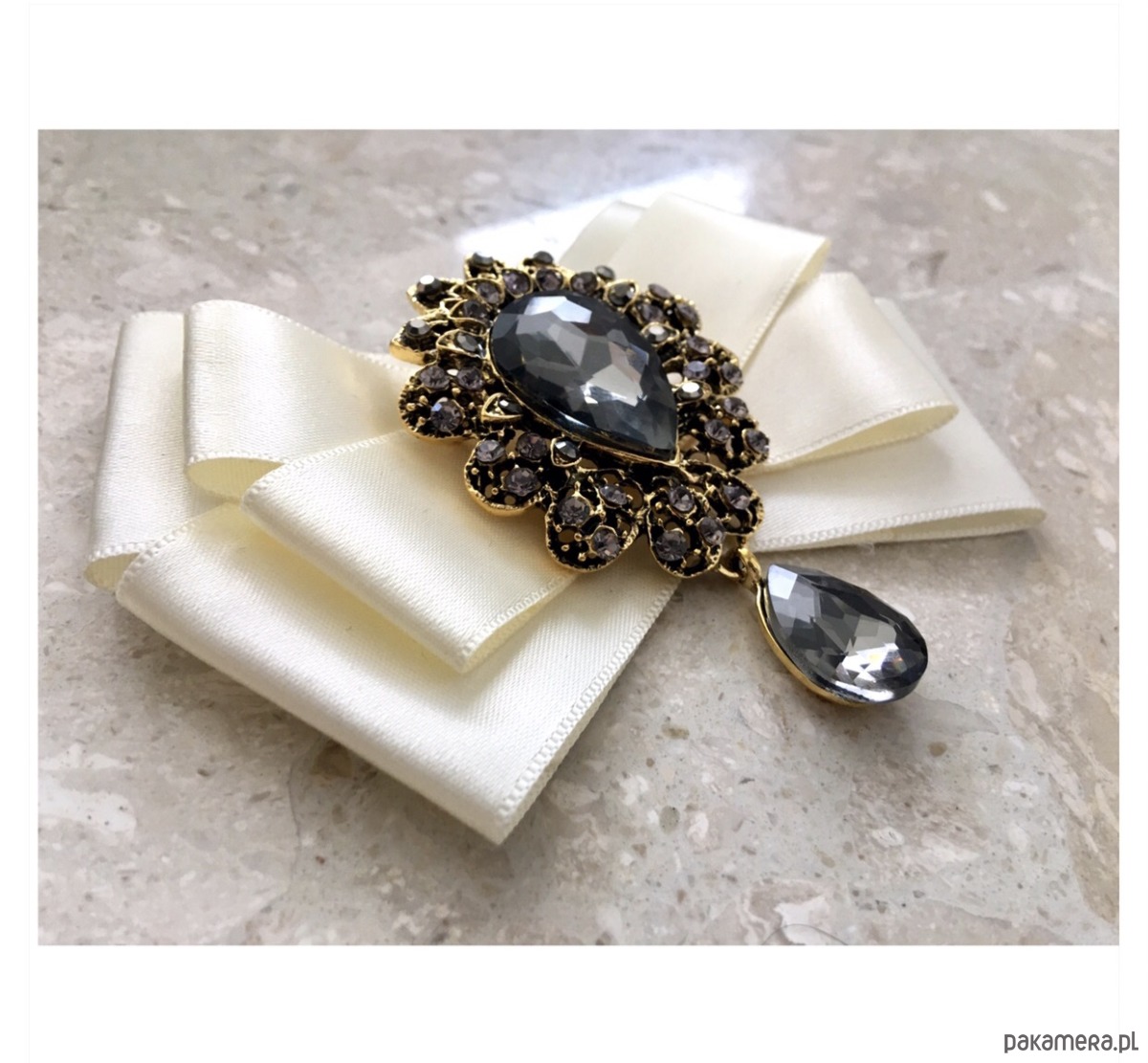 Broszka wykonana z wysokiej jakości taśm i dodatków. Broszka w kolorze ecru/ śmietanki. Na środku Piękna duża dekoracyjna ozdoba z ogromnym kamieniem w kolorze szarym w otoczeniu małych kryształków. Będzie idealnie pasować zarówno do koszul, bluzek, swetrów, sukienek, żakietów oraz do płaszczy, kurtek, szali i chust. Idealna do każdej stylizacji, zarówno do sportowej jak również do eleganckich stylizacji.