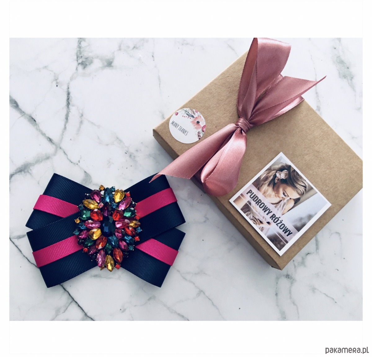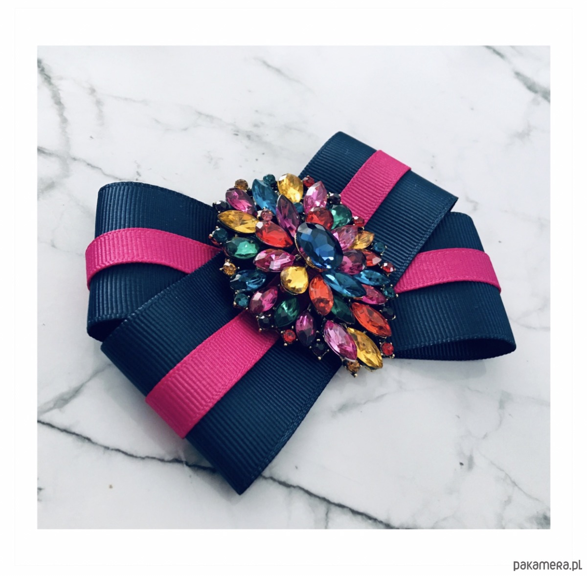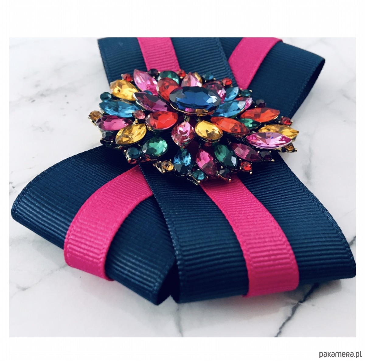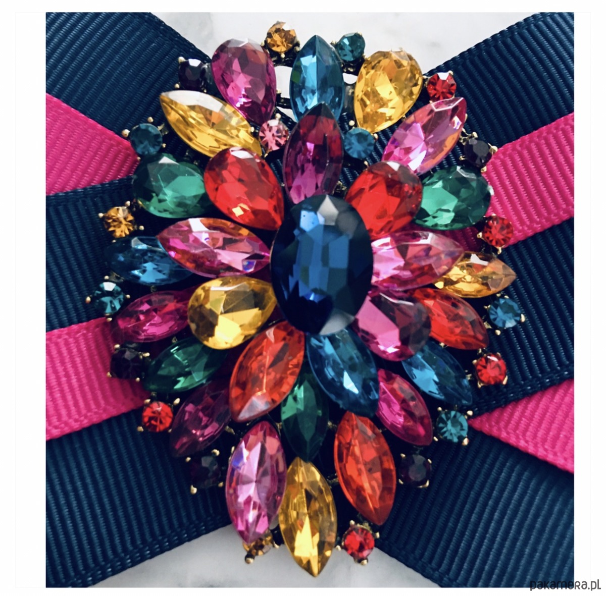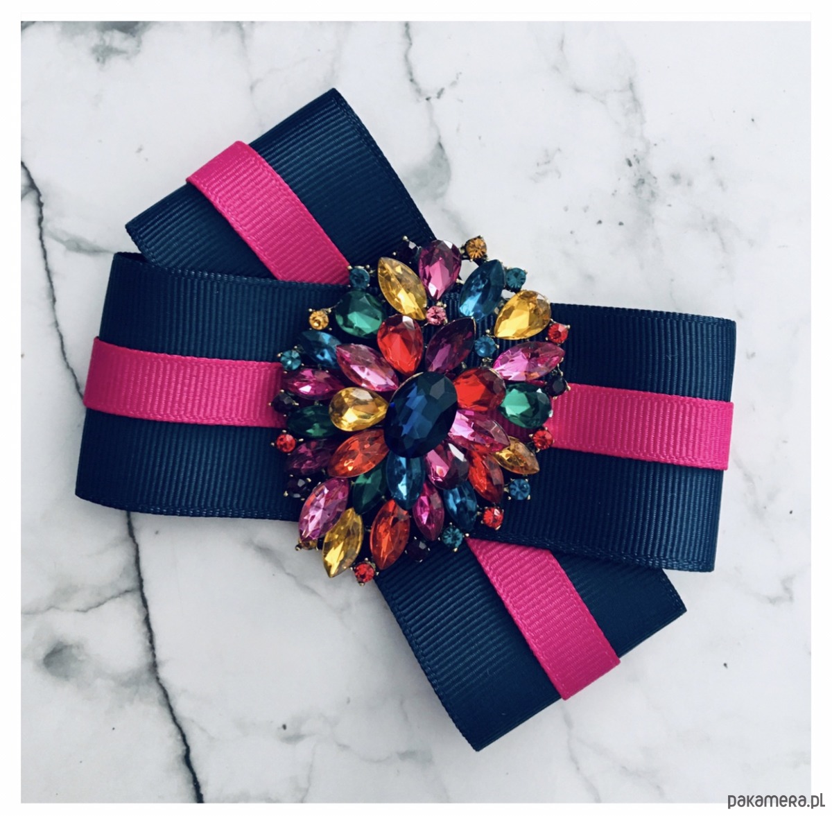 Broszka wykonana z wysokiej jakości taśm i dodatków. Brosza w kolorze granatu i fuksji. Na środku naszyta ogromna ozdoba biżuteryjna z kryształków we wszystkich kolorach tęczy.