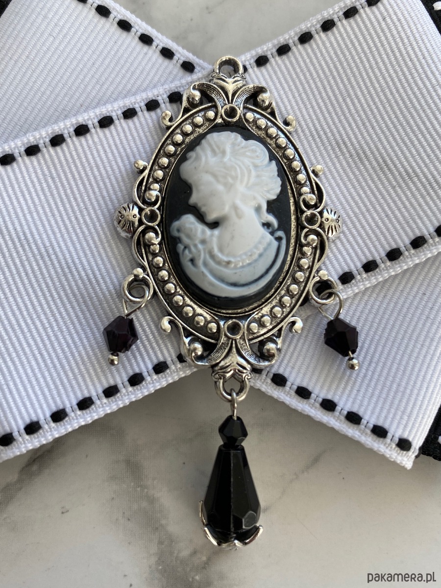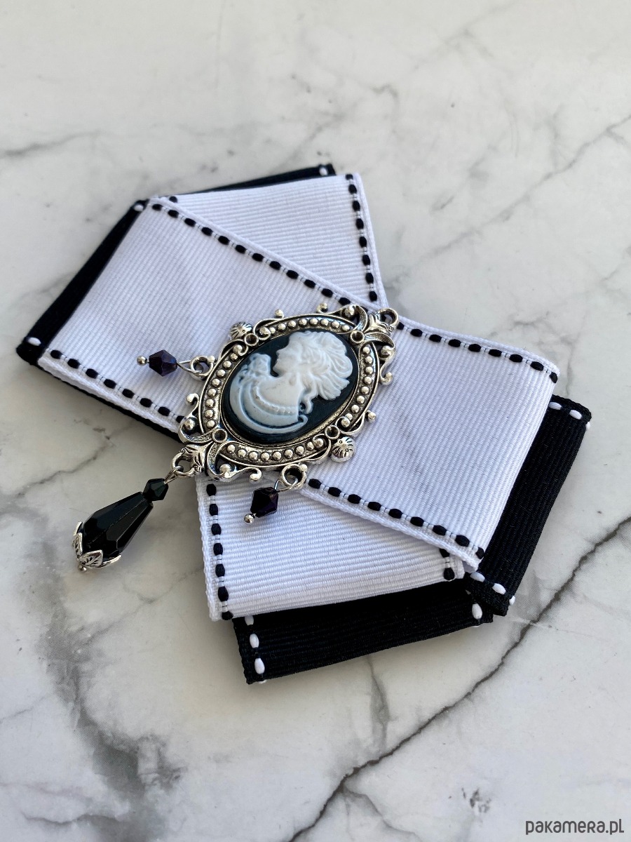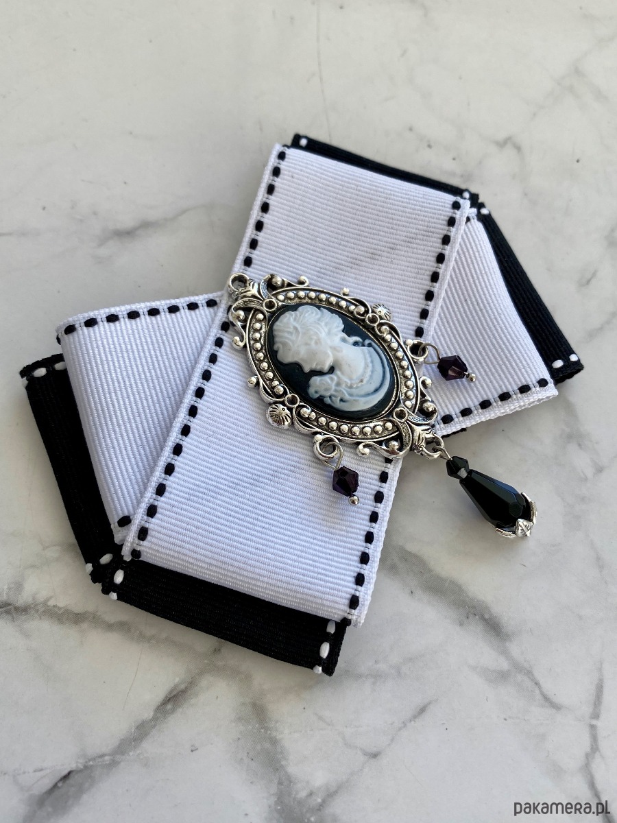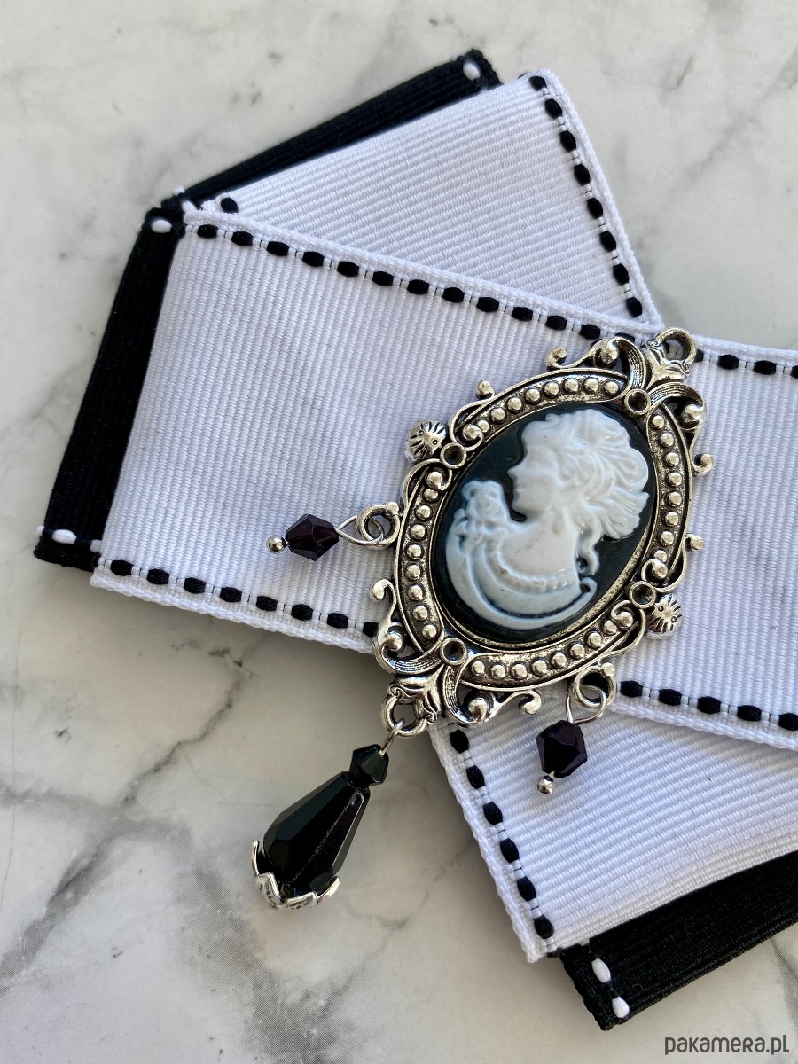 Na środku naszyta śliczna ozdoba biżuteryjna z kryształkami. Stylowa Kamea w kolorach w kolorach czarno białych z czarnymi wiszącymi paciorkami.