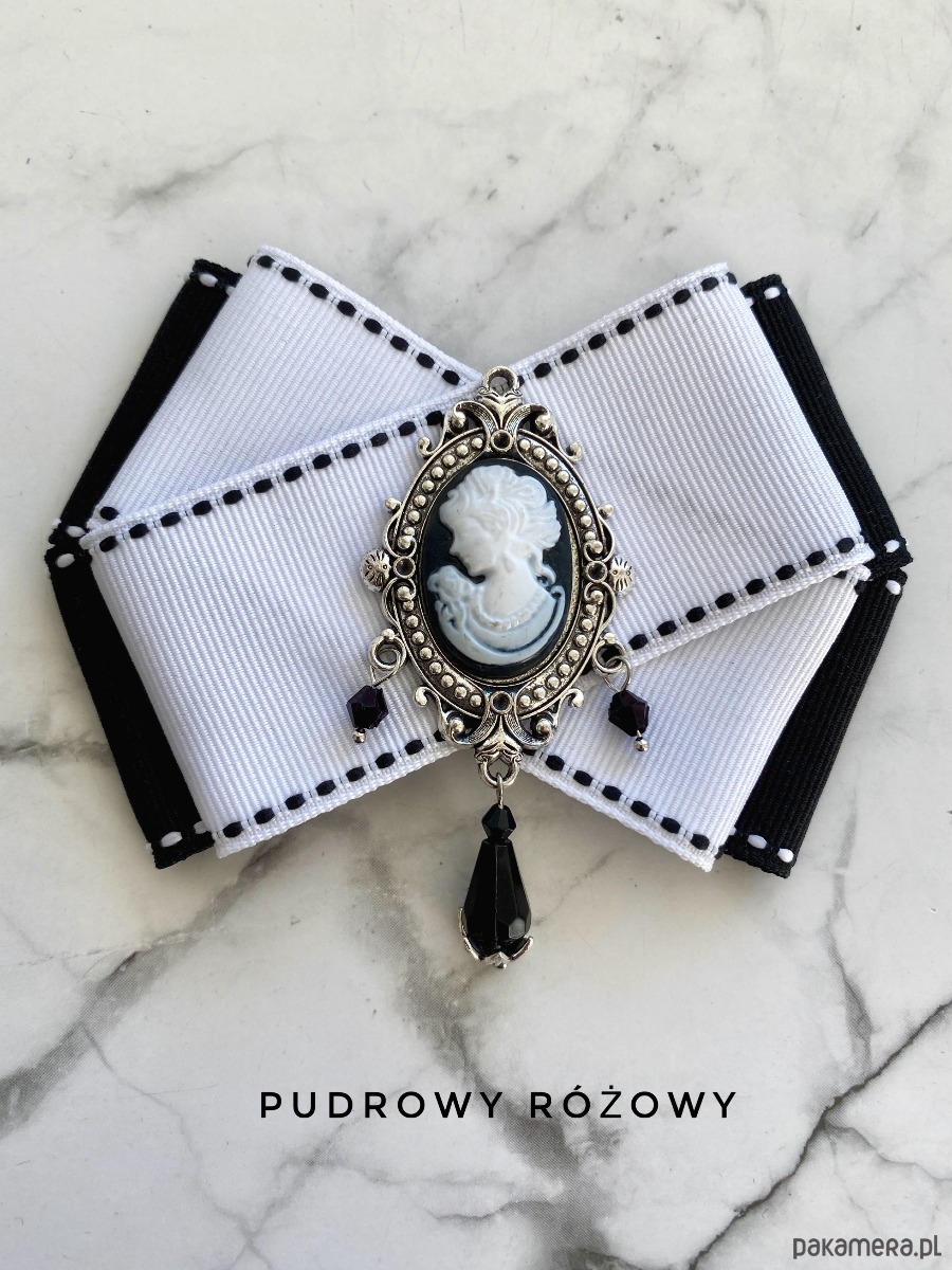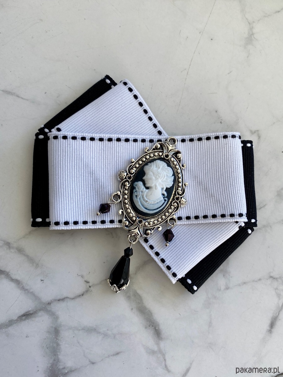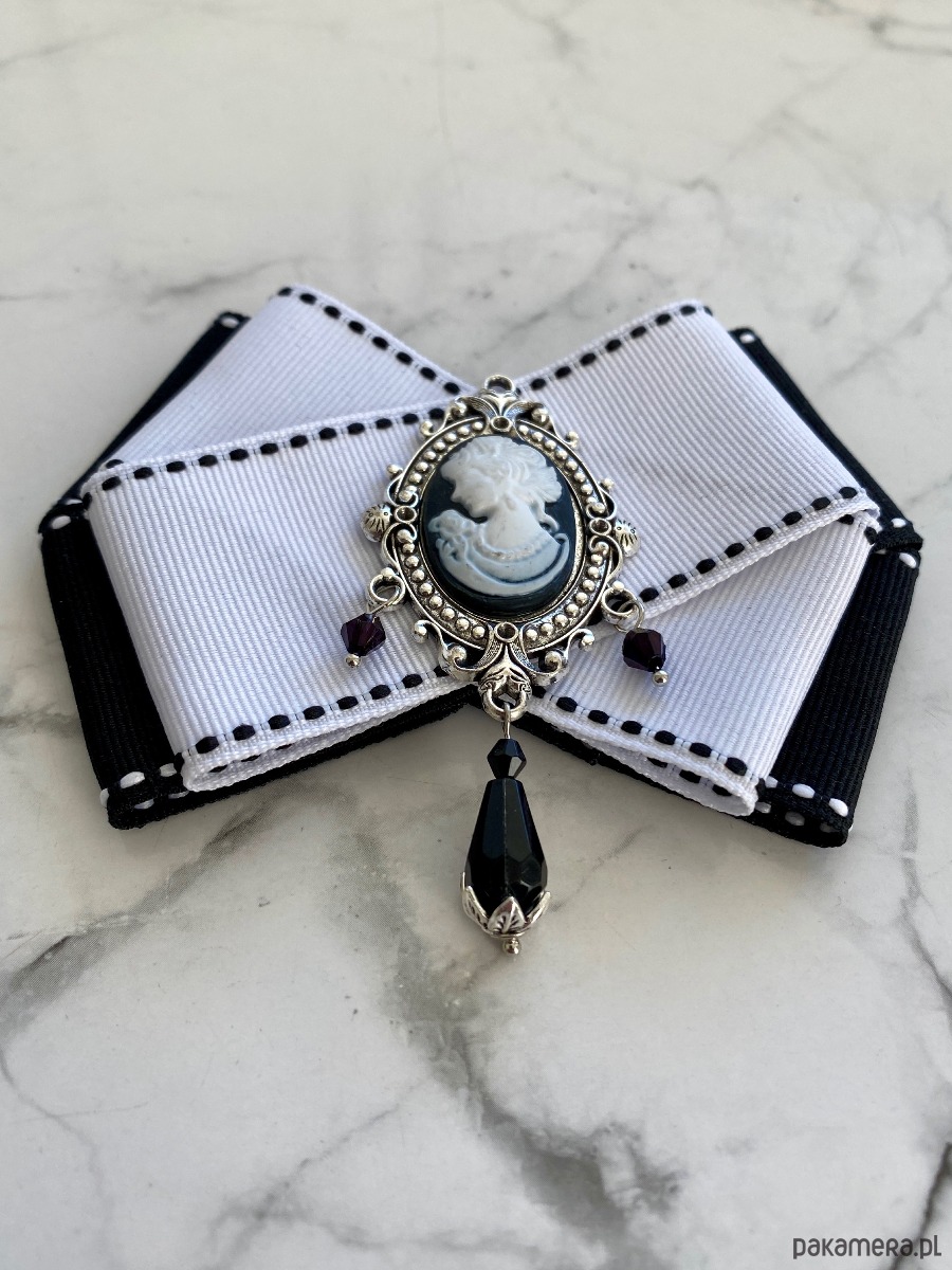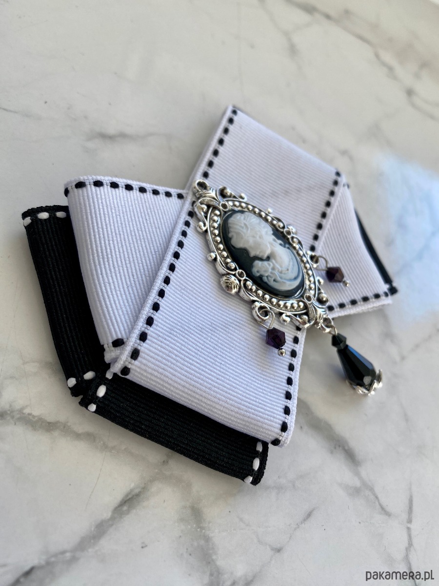 Na środku naszyta śliczna ozdoba biżuteryjna z kryształkami. Stylowa Kamea w kolorach w kolorach czarno białych z czarnymi wiszącymi paciorkami.