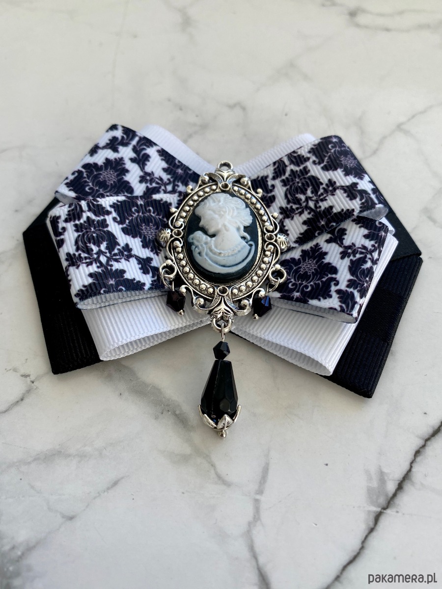 Na środku naszyta śliczna ozdoba biżuteryjna z kryształkami. Stylowa Kamea w kolorach w kolorach czarno białych z czarnymi wiszącymi paciorkami.