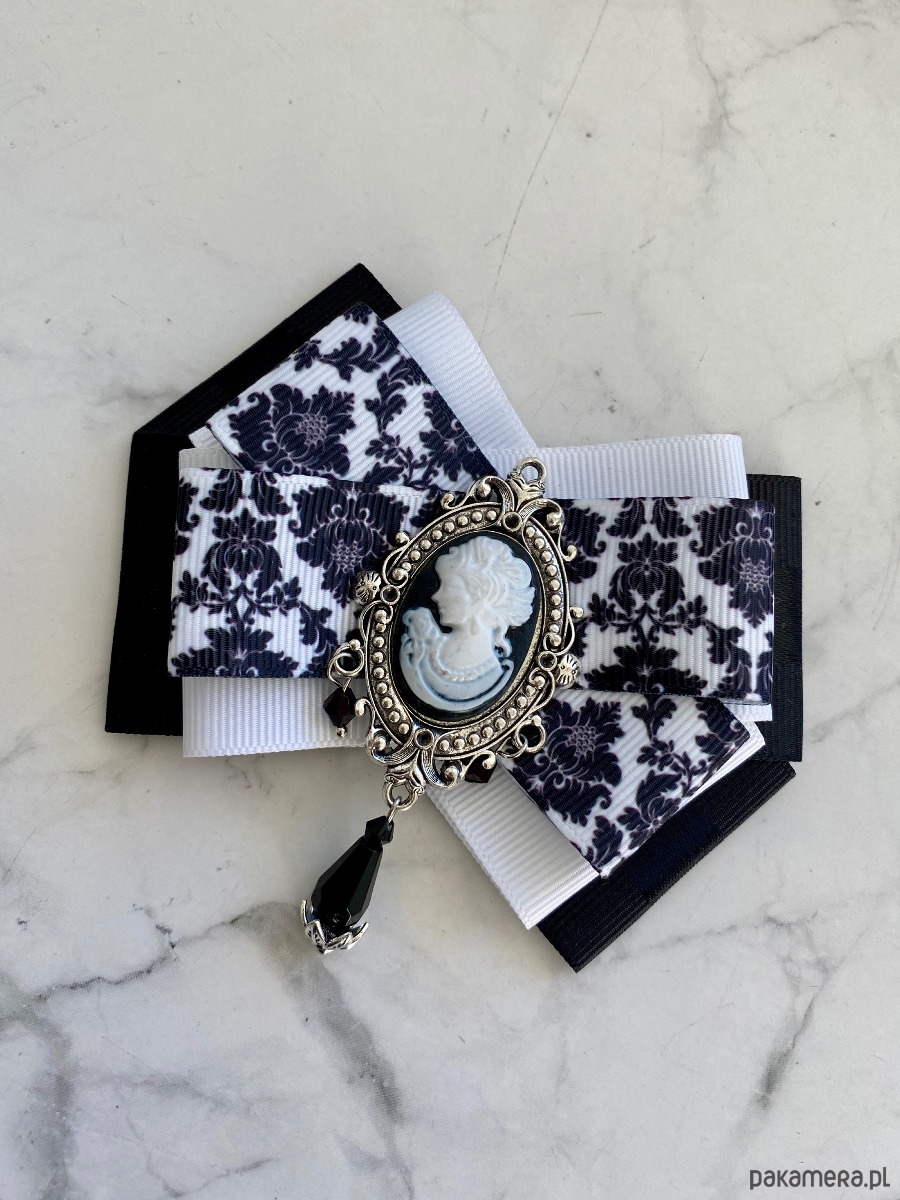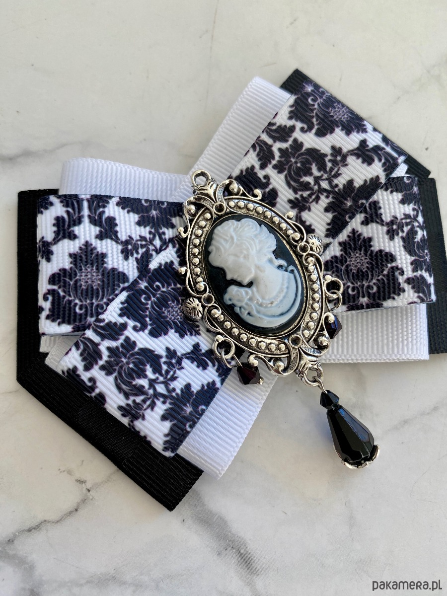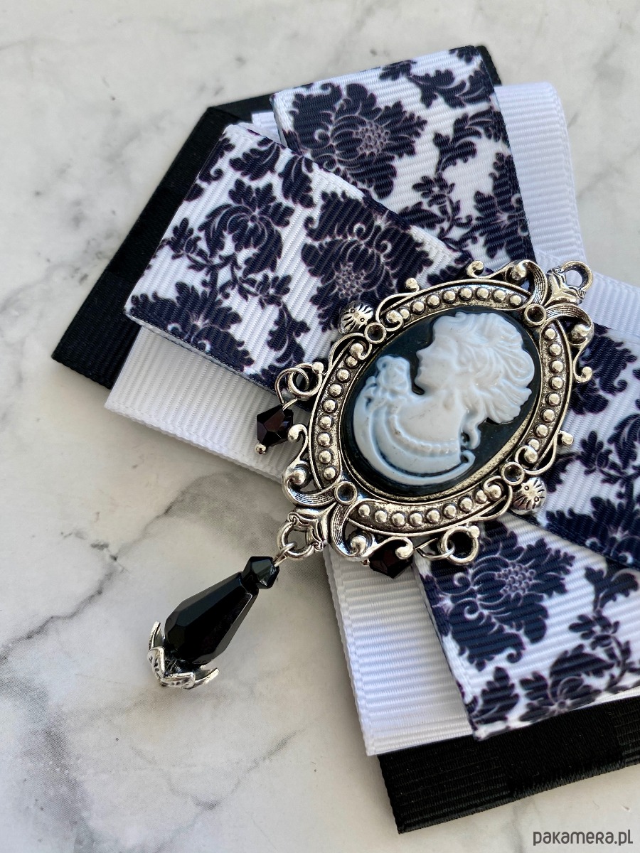 Na środku naszyta śliczna ozdoba biżuteryjna z kryształkami. Stylowa Kamea w kolorach w kolorach czarno białych z czarnymi wiszącymi paciorkami.