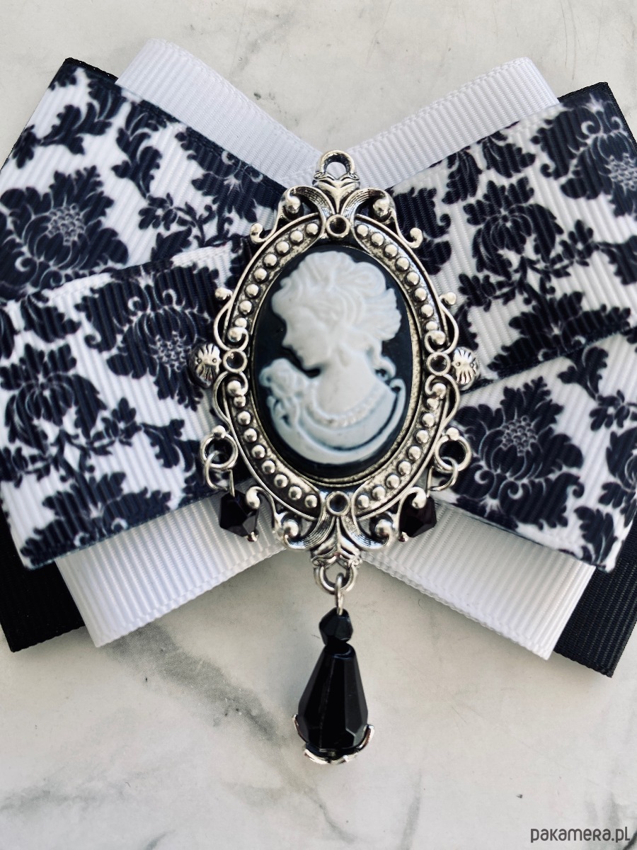 Na środku naszyta śliczna ozdoba biżuteryjna z kryształkami. Stylowa Kamea w kolorach w kolorach czarno białych z czarnymi wiszącymi paciorkami.