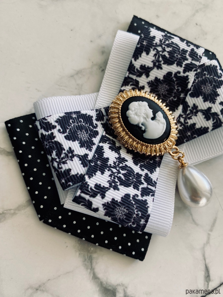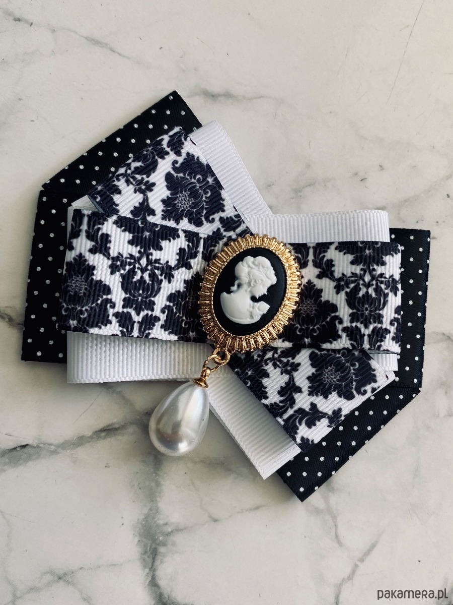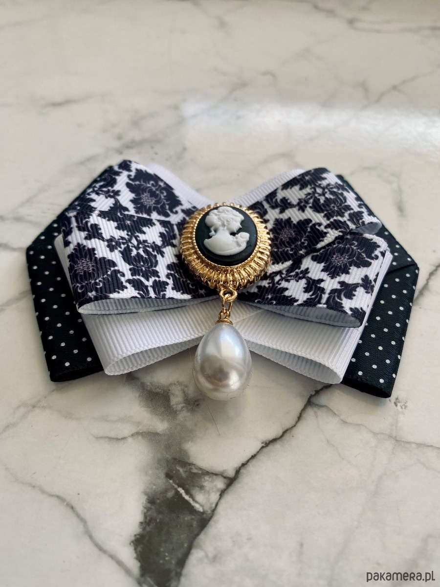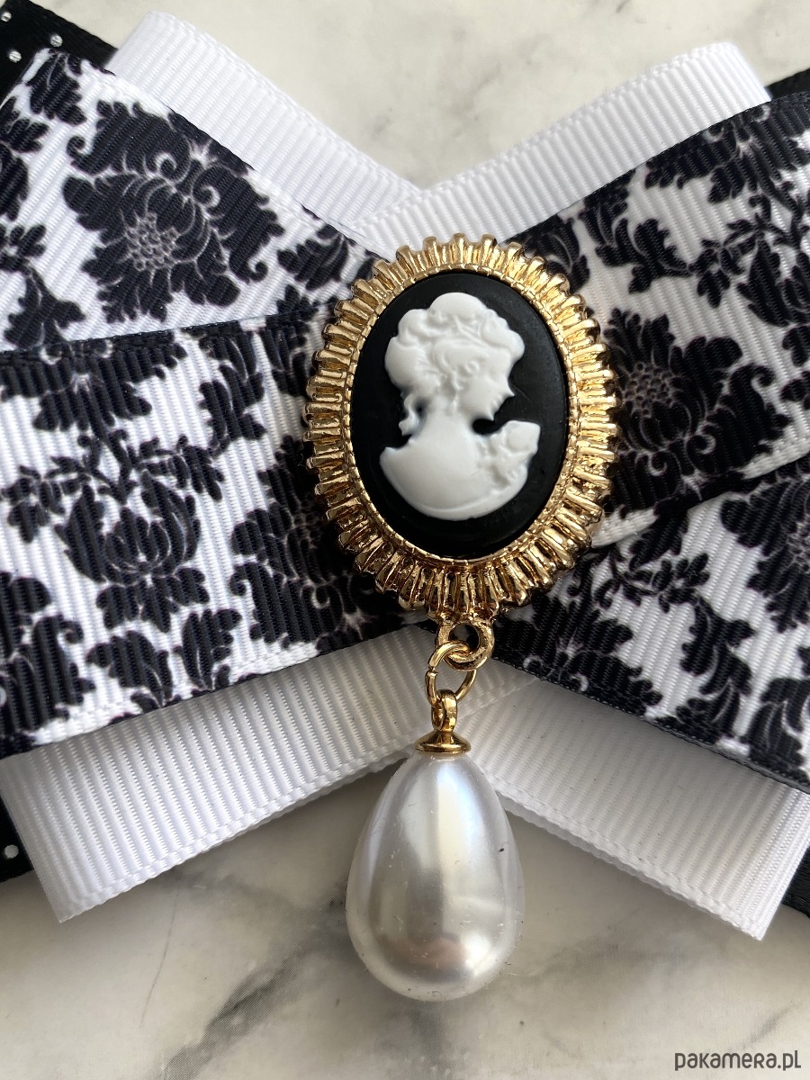 Stylowa Kamea w kolorach czarno białych z wiszącą perłą.