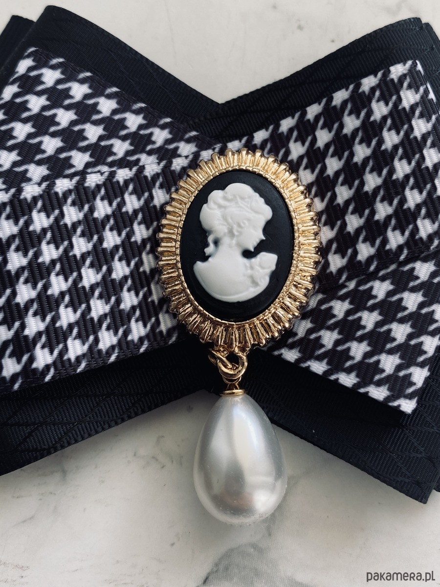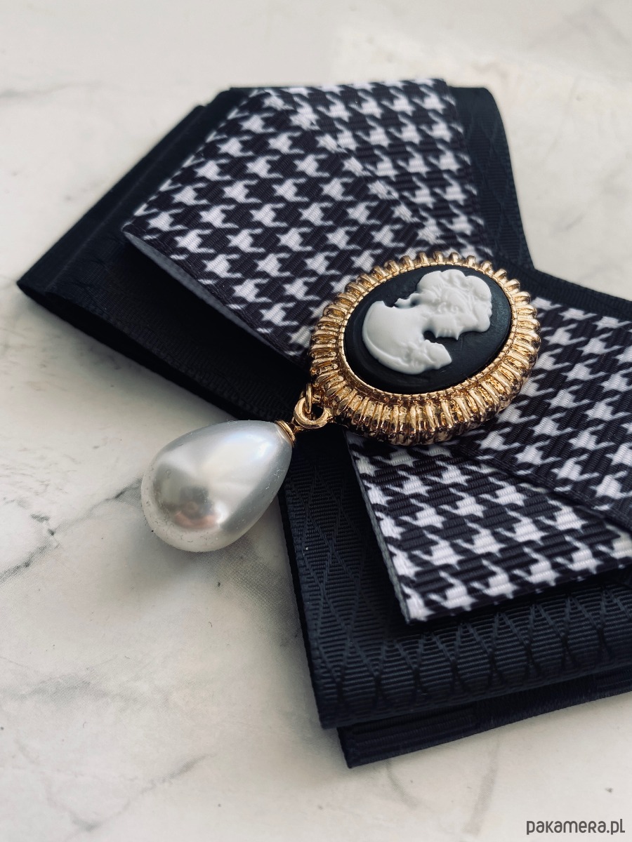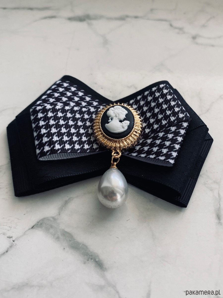 Stylowa Kamea w kolorach czarno białych z wiszącą perłą.