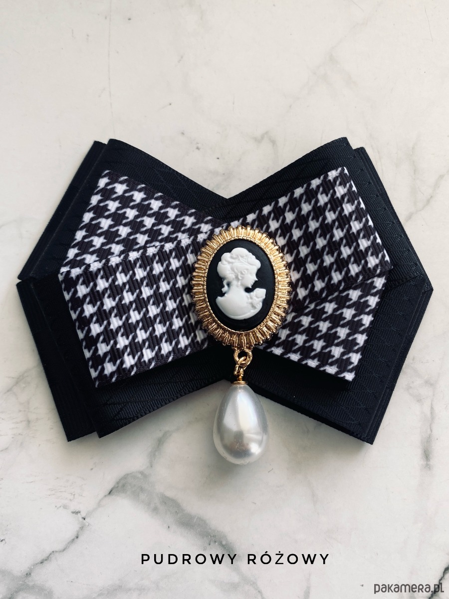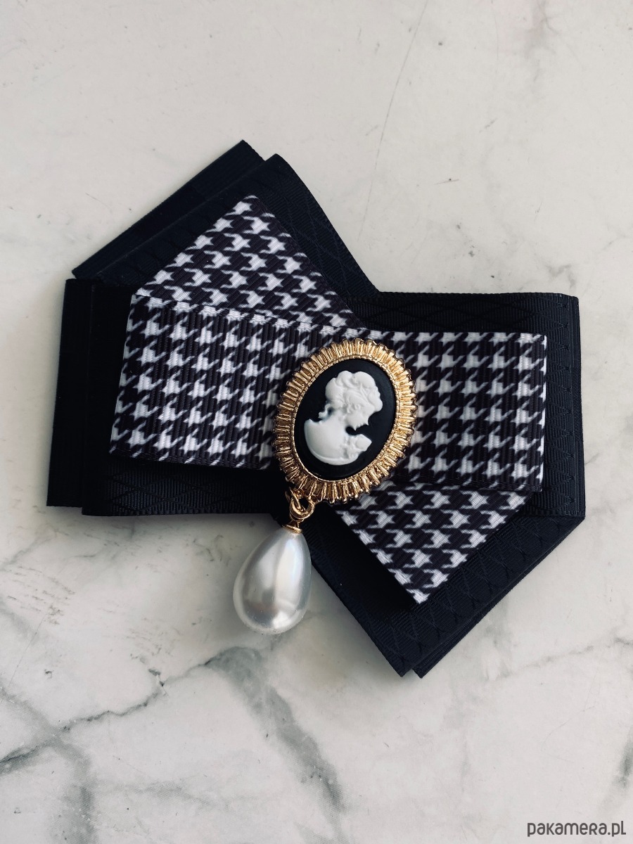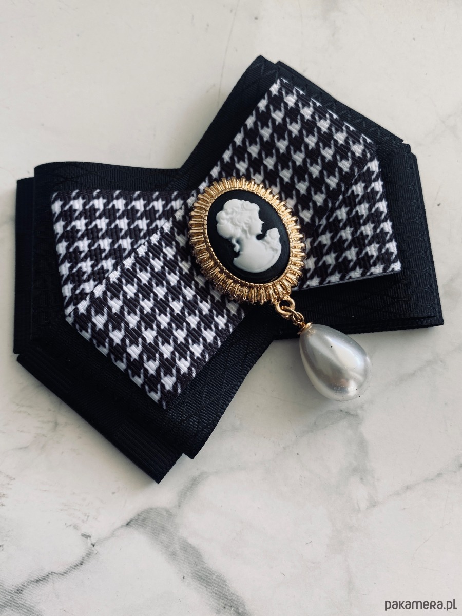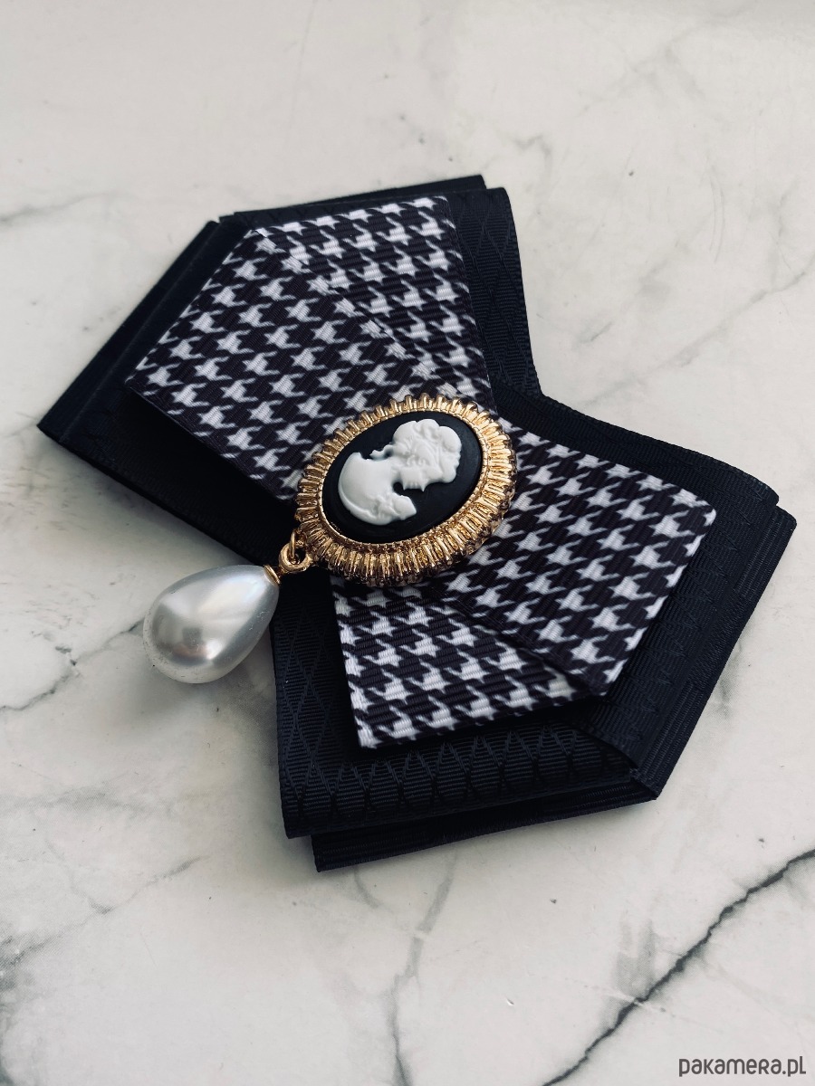 Stylowa Kamea w kolorach czarno białych z wiszącą perłą.