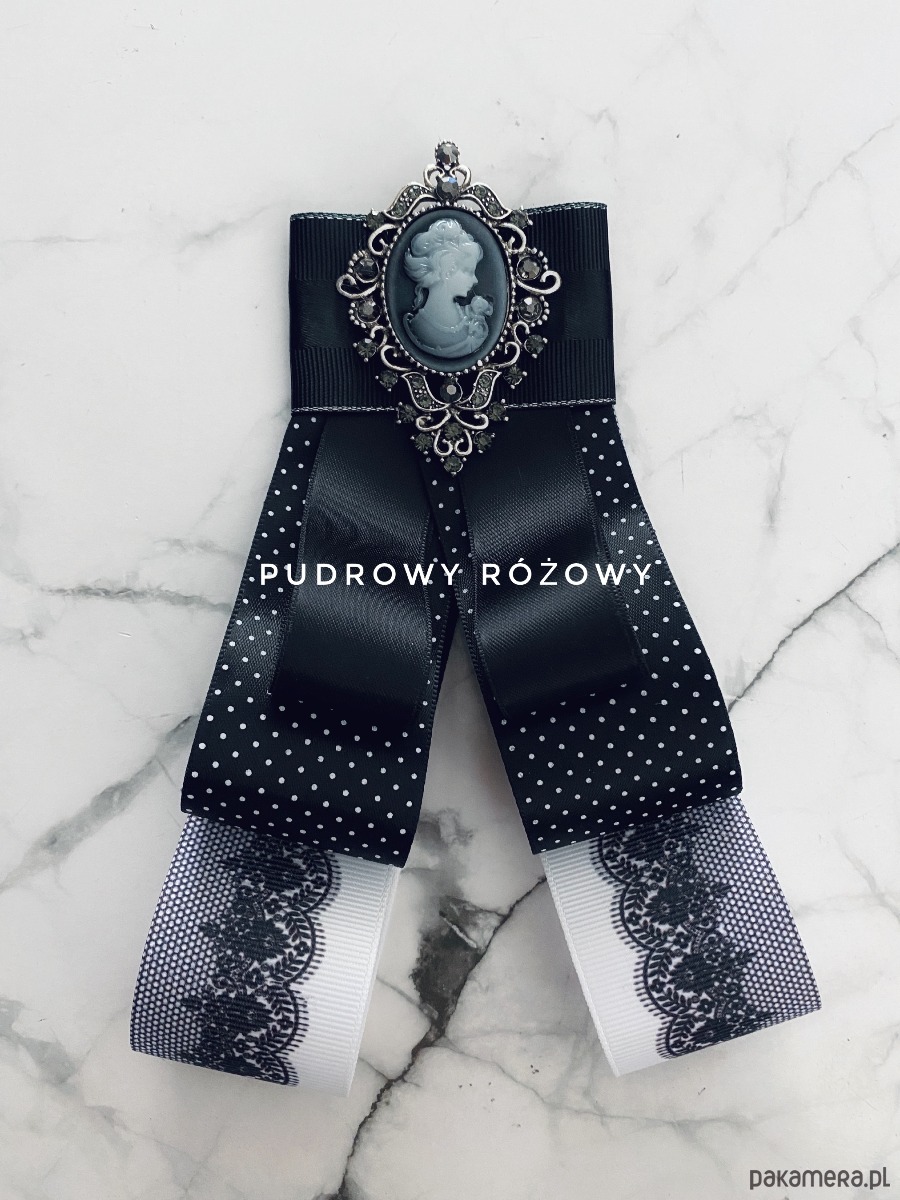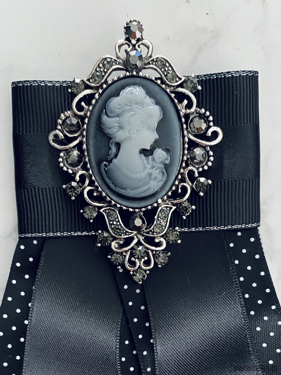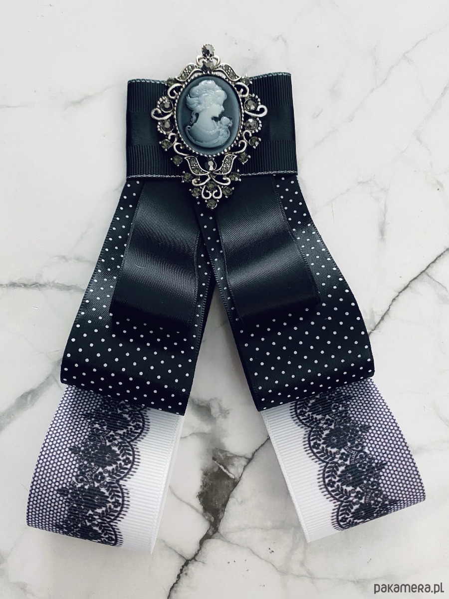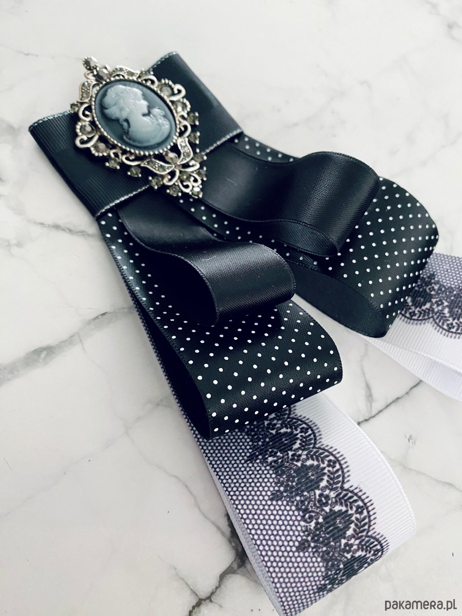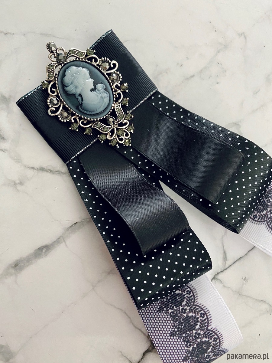 Broszka wykonana z wysokiej jakości taśm i dodatków. Brosza w kolorach czerni i bieli. Broszka Z niezwykle dekoracyjną Kameą.