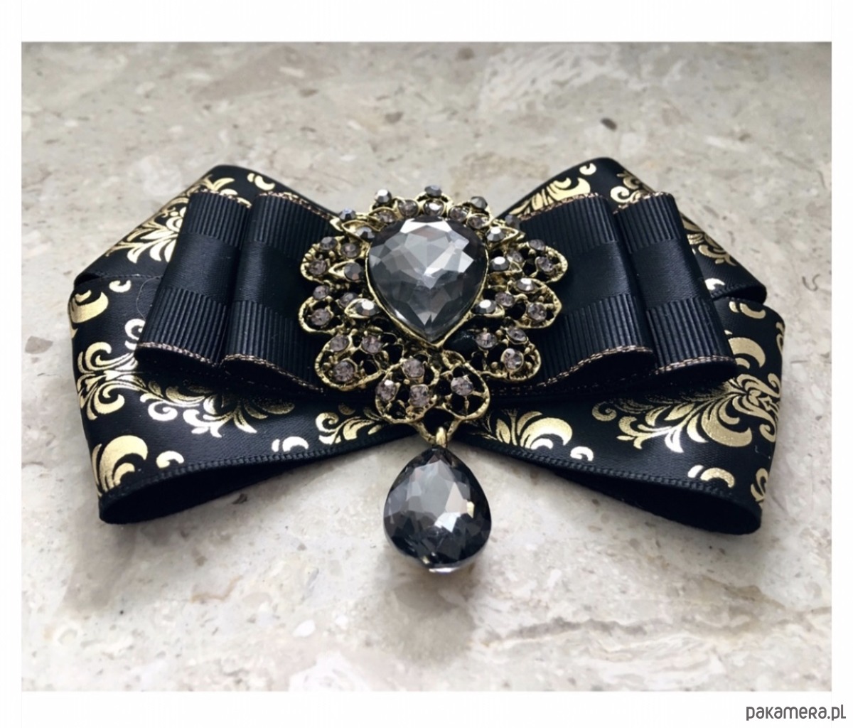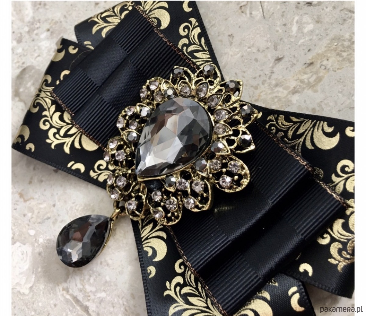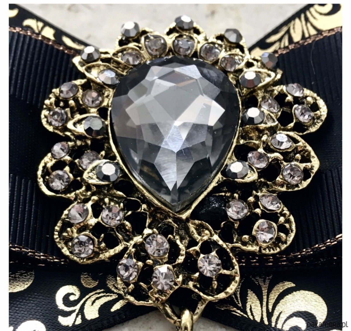 Broszka wykonana z wysokiej jakości taśm i dodatków. Brosza w kolorze czerni i złota. Wstążki w stylu glamour. Klasa sama w sobie. Na środku naszyta ogromna ozdoba dekoracyjna Przepiękny kryształ osadzony w koronkowej oprawie z małymi kryształkami. Będzie idealnie pasować zarówno do koszul, bluzek, swetrów, sukienek, żakietów oraz do płaszczy, kurtek, szali i chust. Idealna do każdej stylizacji, zarówno do sportowej jak również do eleganckich stylizacji.