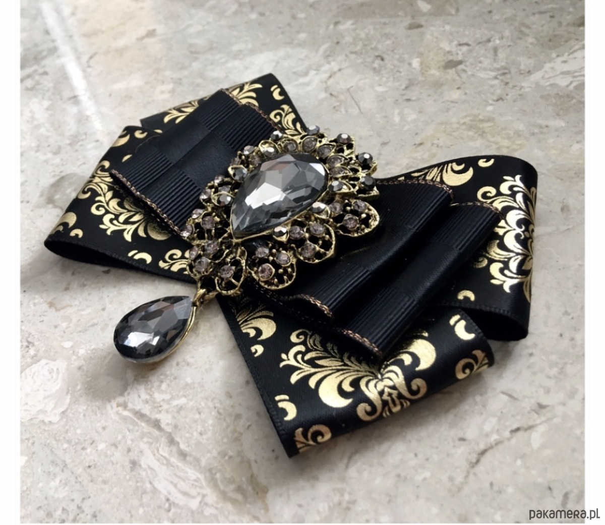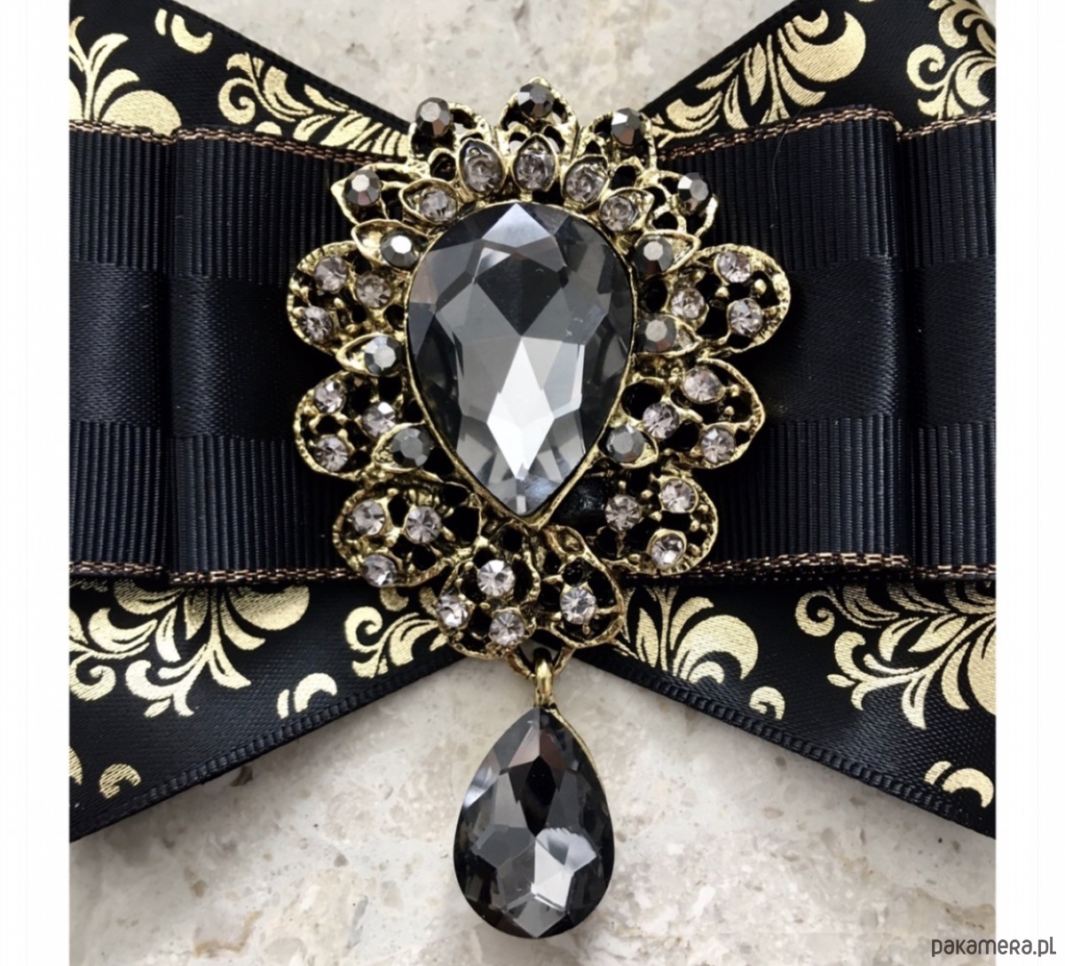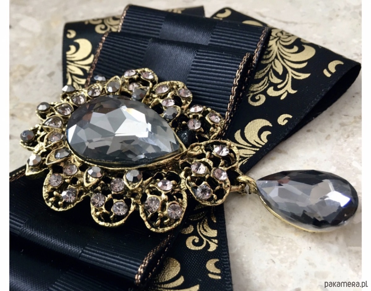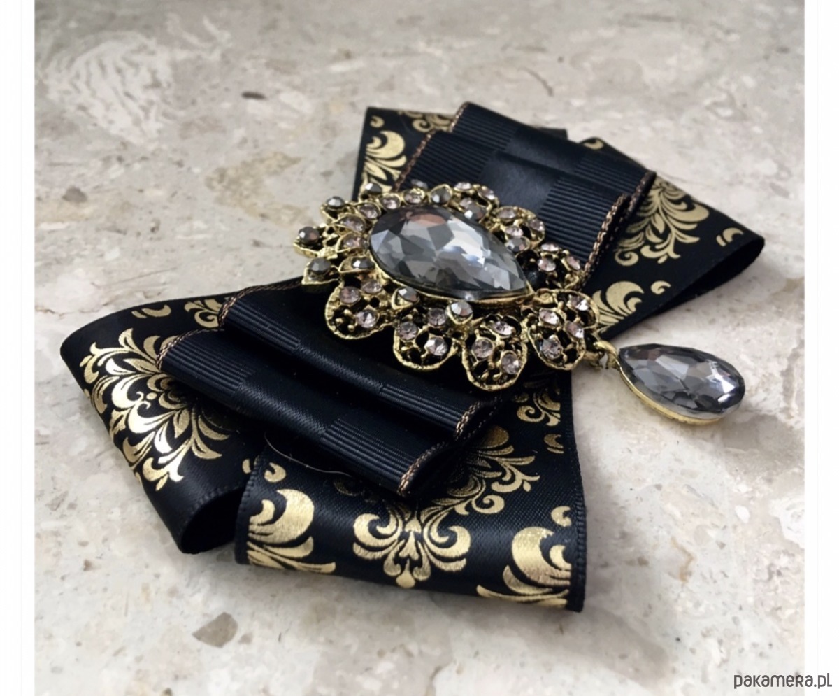 Broszka wykonana z wysokiej jakości taśm i dodatków. Brosza w kolorze czerni i złota. Wstążki w stylu glamour. Klasa sama w sobie. Na środku naszyta ogromna ozdoba dekoracyjna Przepiękny kryształ osadzony w koronkowej oprawie z małymi kryształkami. Będzie idealnie pasować zarówno do koszul, bluzek, swetrów, sukienek, żakietów oraz do płaszczy, kurtek, szali i chust. Idealna do każdej stylizacji, zarówno do sportowej jak również do eleganckich stylizacji.