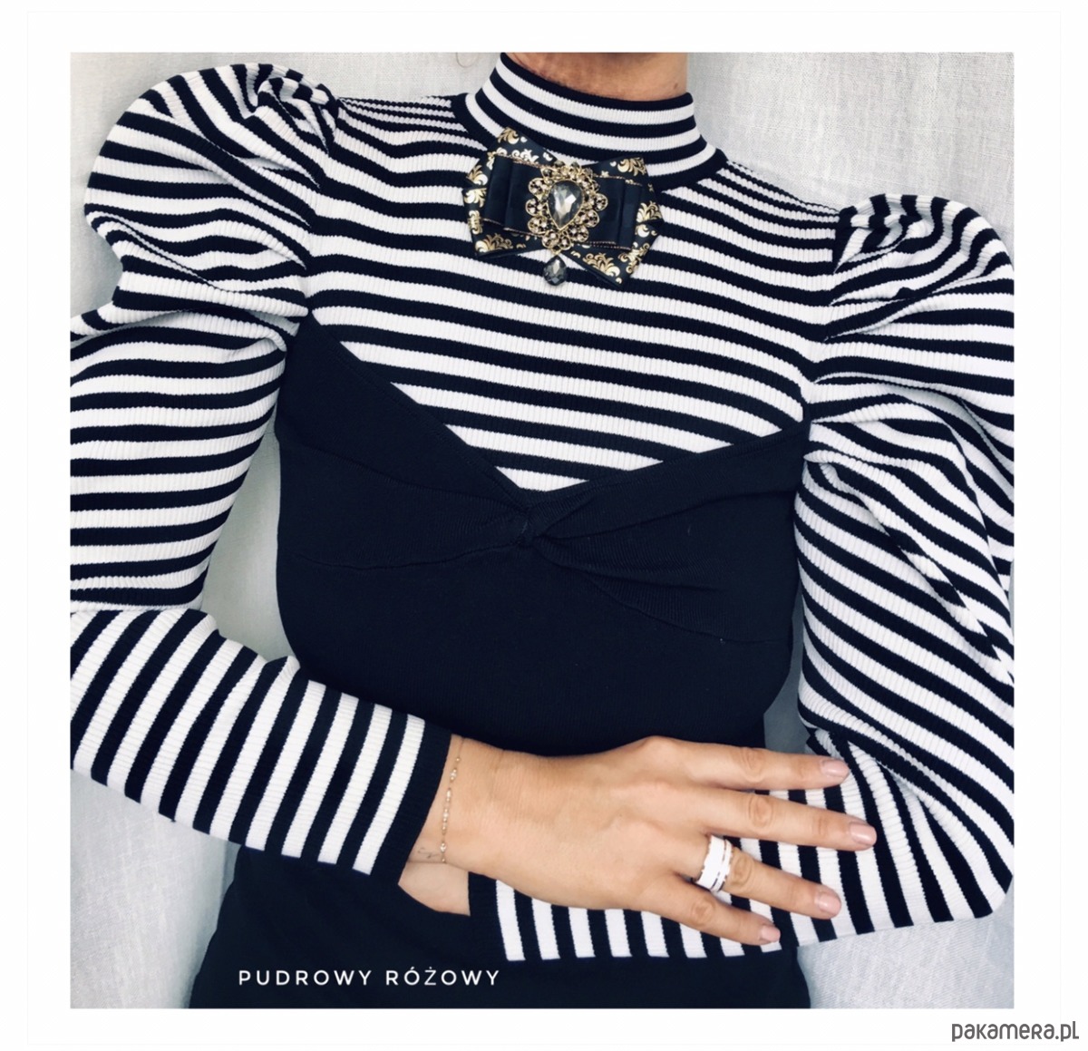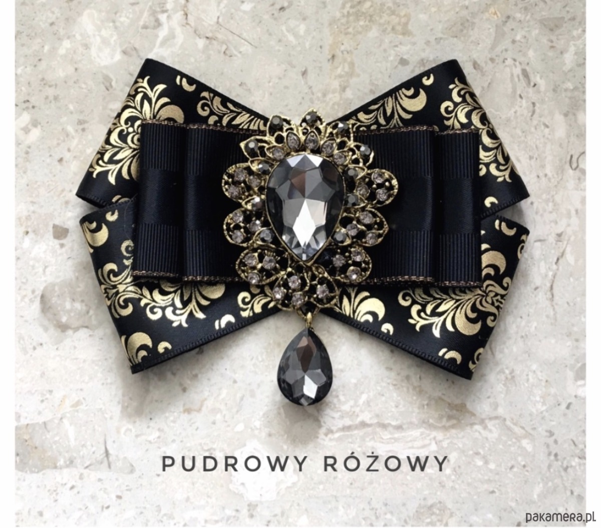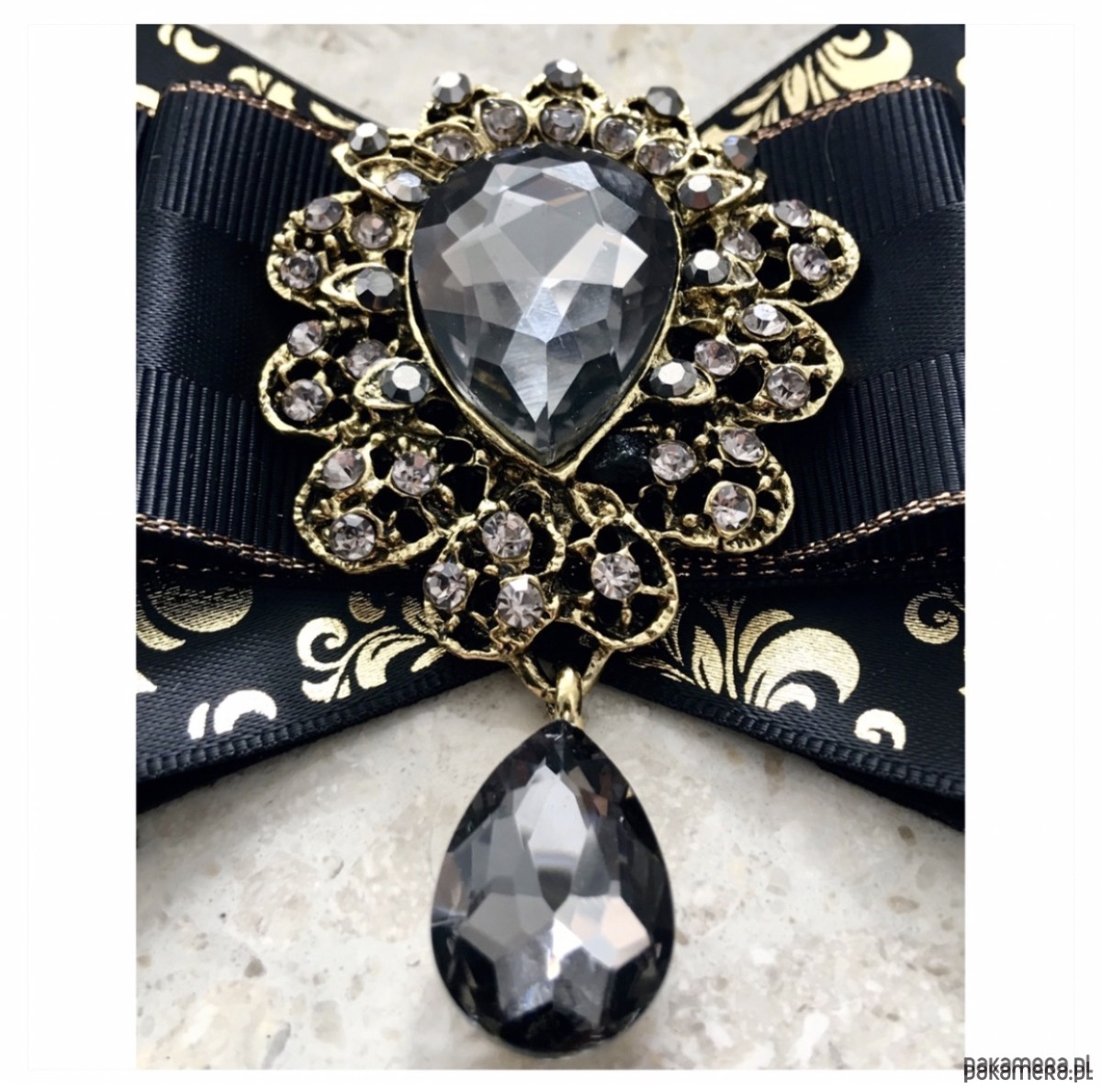 Broszka wykonana z wysokiej jakości taśm i dodatków. Brosza w kolorze czerni i złota. Wstążki w stylu glamour. Klasa sama w sobie. Na środku naszyta ogromna ozdoba dekoracyjna Przepiękny kryształ osadzony w koronkowej oprawie z małymi kryształkami. Będzie idealnie pasować zarówno do koszul, bluzek, swetrów, sukienek, żakietów oraz do płaszczy, kurtek, szali i chust. Idealna do każdej stylizacji, zarówno do sportowej jak również do eleganckich stylizacji.