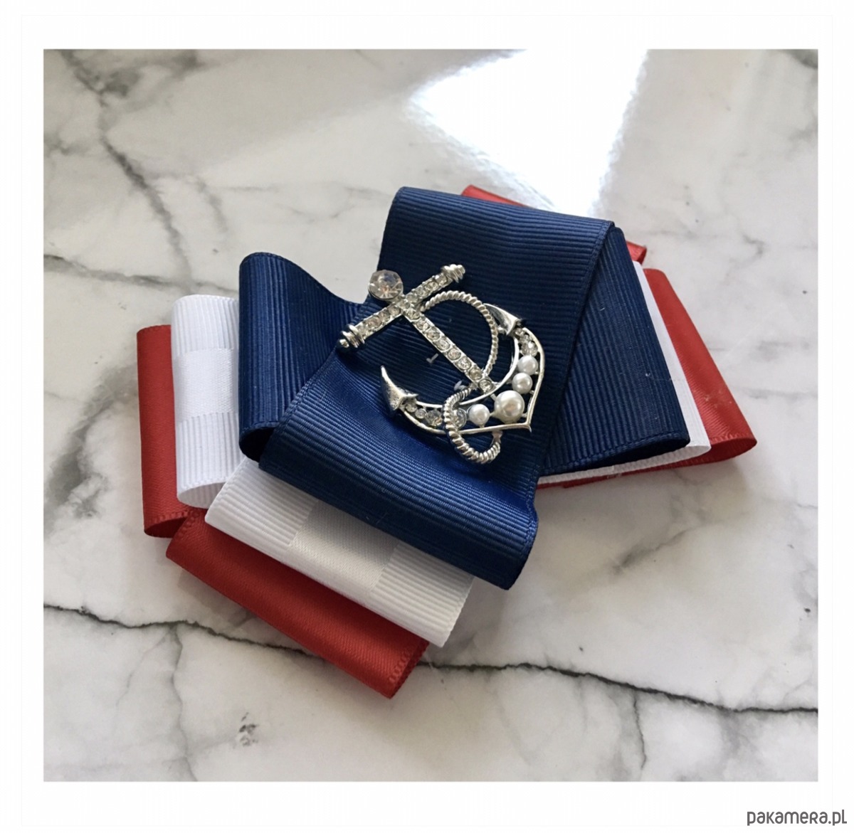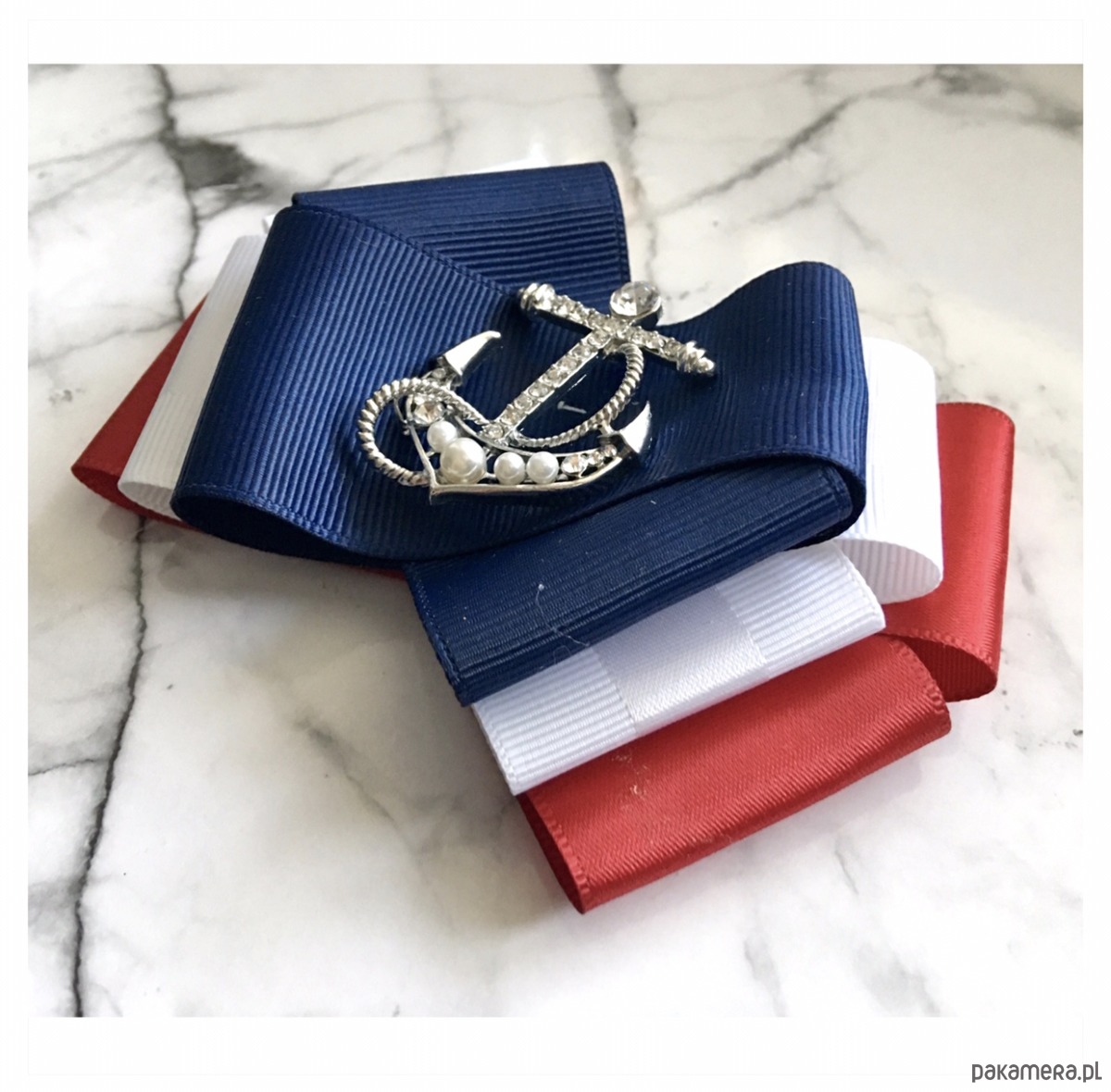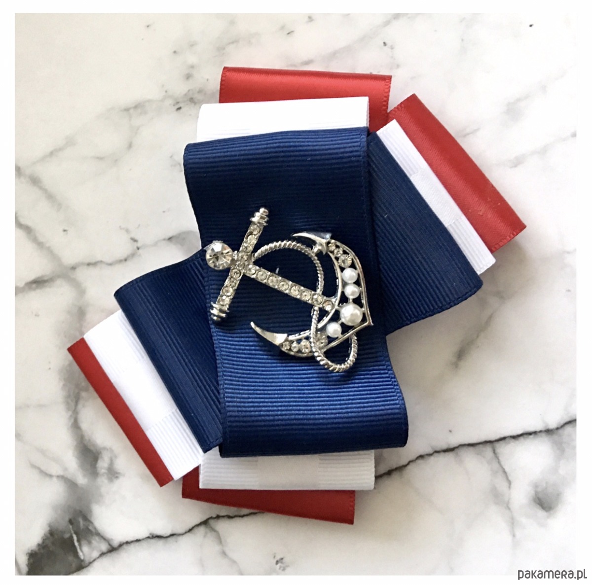 Broszka wykonana z wysokiej jakości taśm i dodatków. Broszka w klimacie marynarskim. W kolorach związanych z morzem, wakacjami i cudownym wakacyjnym klimacie. Granaty, biel i czerwień trio doskonale.