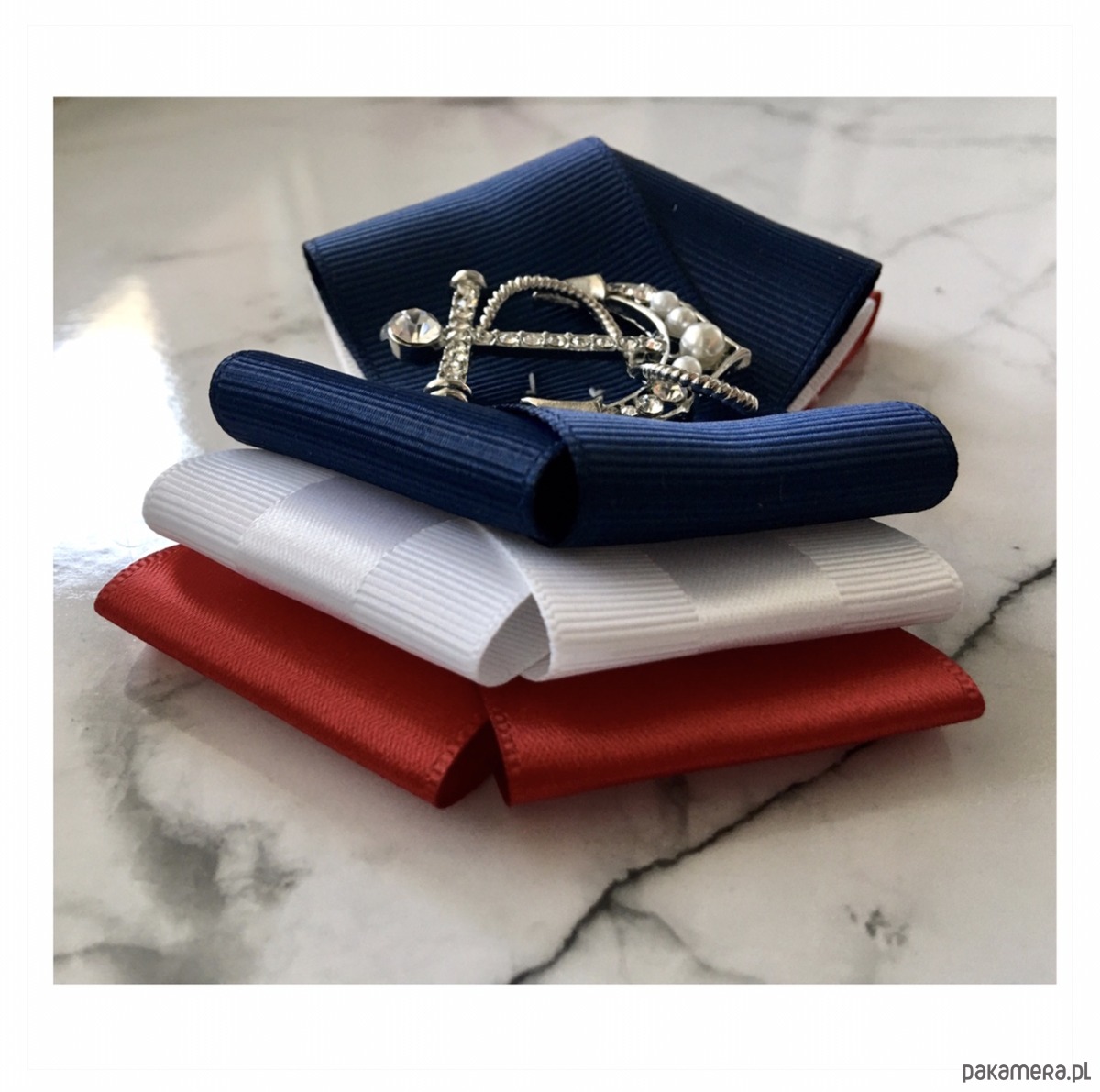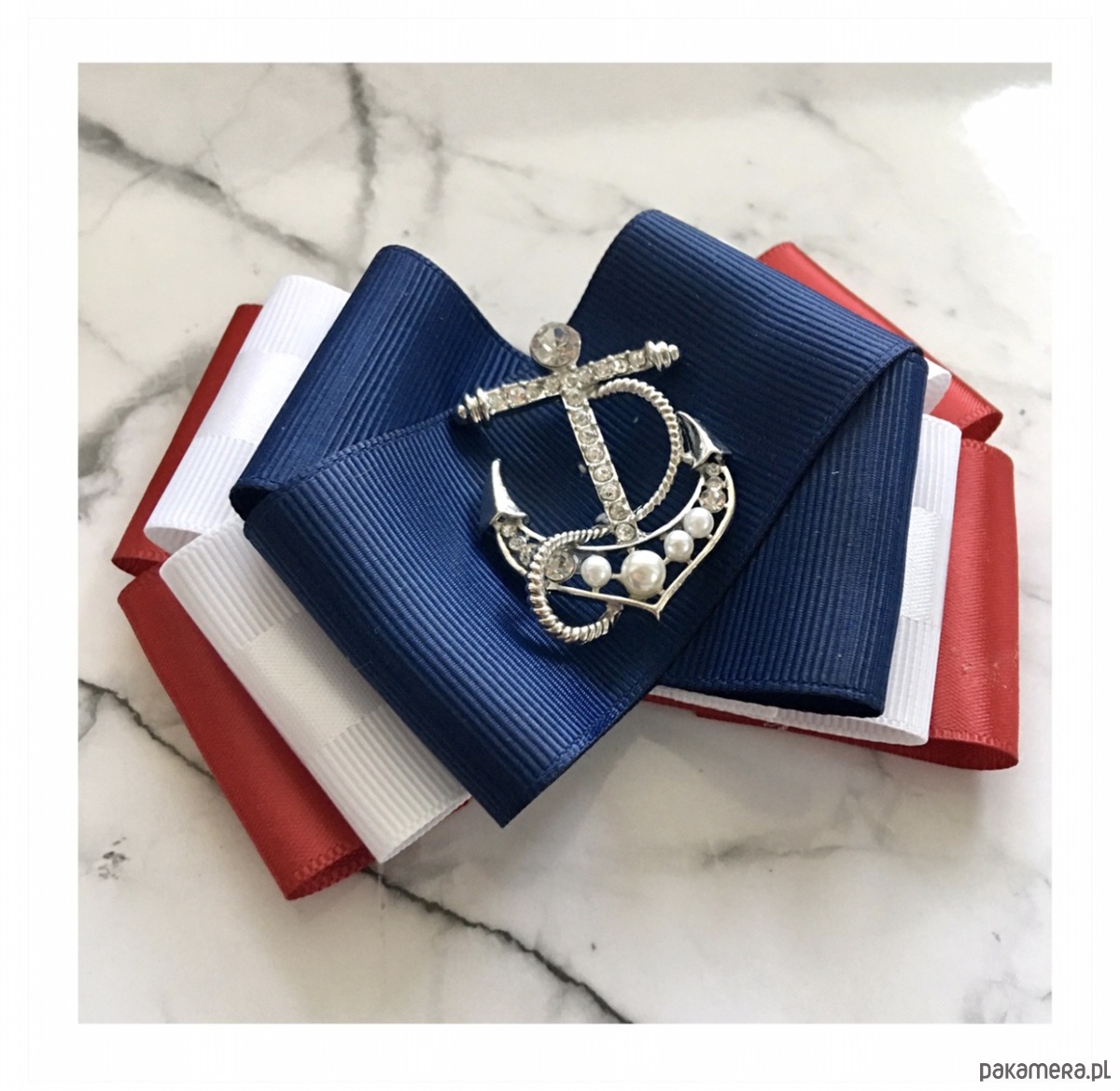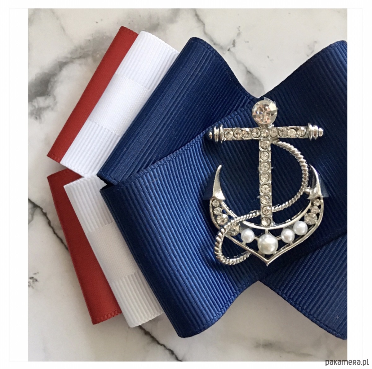 Broszka wykonana z wysokiej jakości taśm i dodatków. Broszka w klimacie marynarskim. W kolorach związanych z morzem, wakacjami i cudownym wakacyjnym klimacie. Granaty, biel i czerwień trio doskonale.